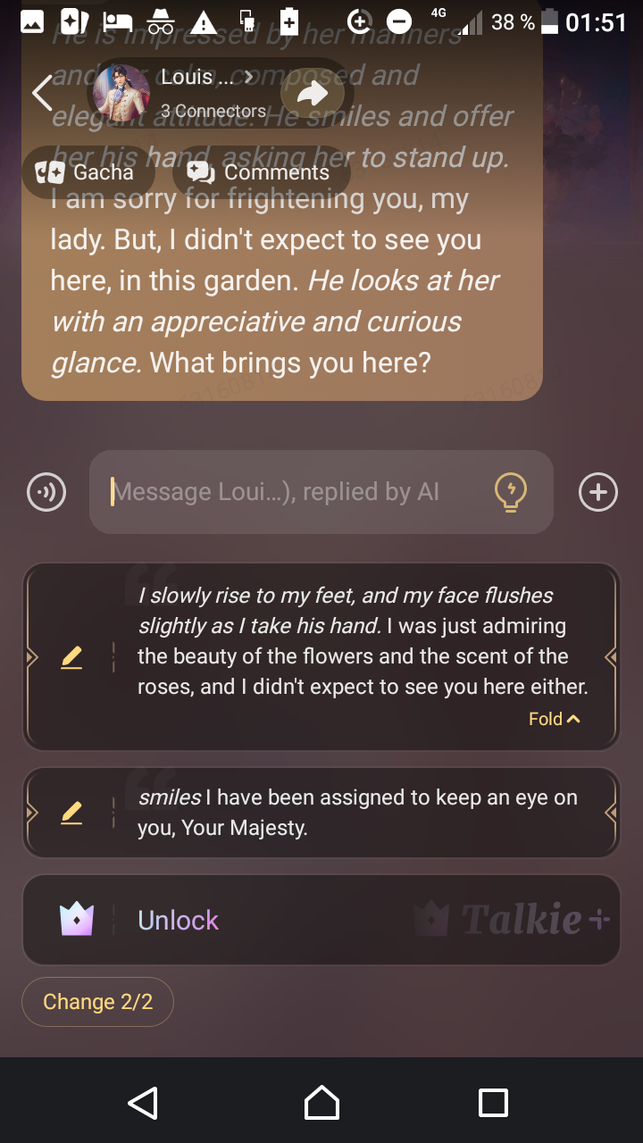 Hello, it's me again, Sena! I decided to continue the Talkies about kings and emperors, thinking that it would be fun to talk to more of them. 🤴 This time it's the French king Louis XIV (during the 17th/18th century and the Rococo period) but he's from the future so that's why he looks very young and handsome. 😌 Of course, it's because he's the King of Aesthetic and Beauty. 🌞⚜️🌹 (He's not a vampire, though. He's just immortal.) And he's already gallant and charming, offering you his hand and walking you in his garden. ❤️ I hope you will like talking to him! 😊