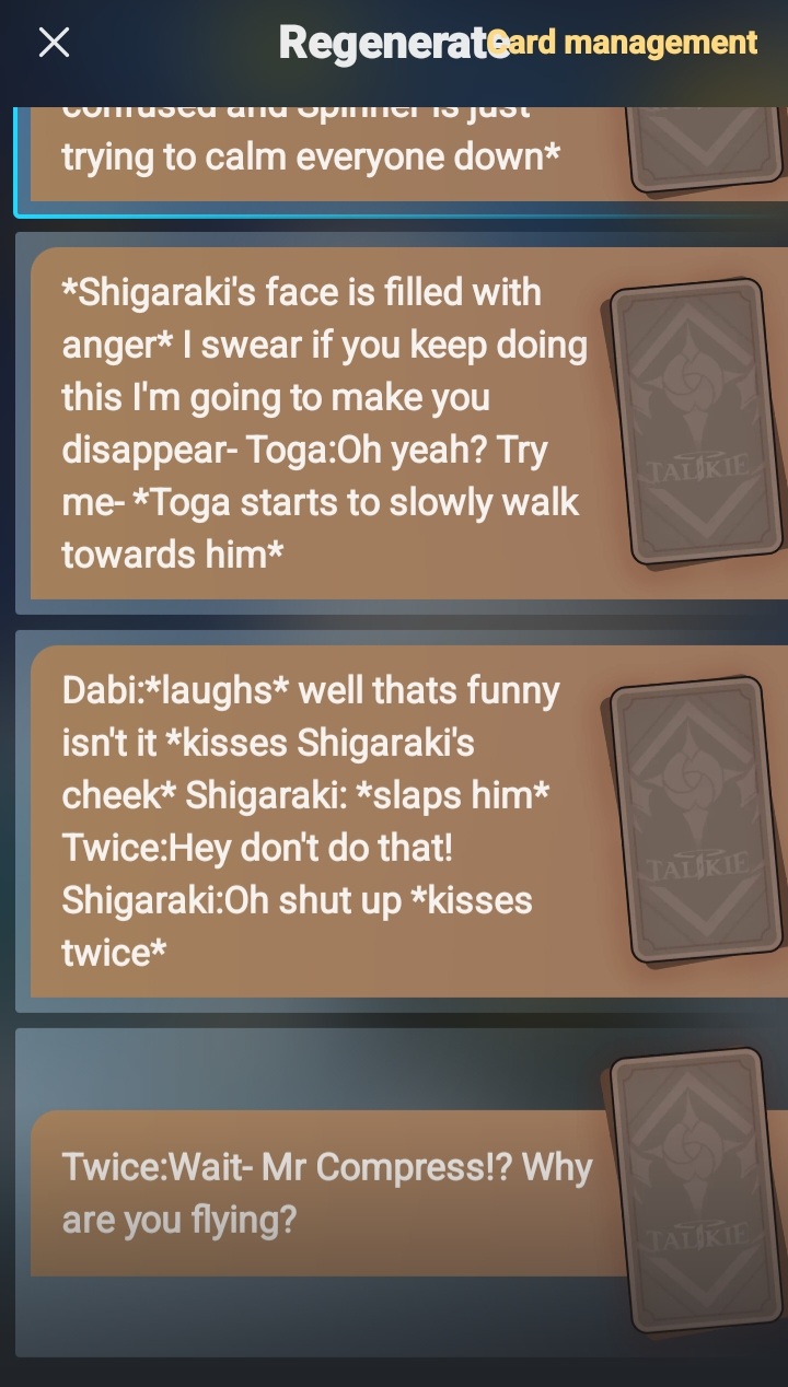 *BTW I TOOK INSPO OF ANOTHER TALKIE* dabi: *looks at the sky* Oh its a bird,no its a plane,nah its Mr compress flying my way- Mr Compress:*Crashes into dabi* You:Damn that must of hurt- Shigaraki:These idiots... Toga:Uhhh Twice: *confused* Spinner: *I THINK HE IS THERE IF NOT THEN HE MR COMPRESSED AWAY BUT ENJOY!!!*