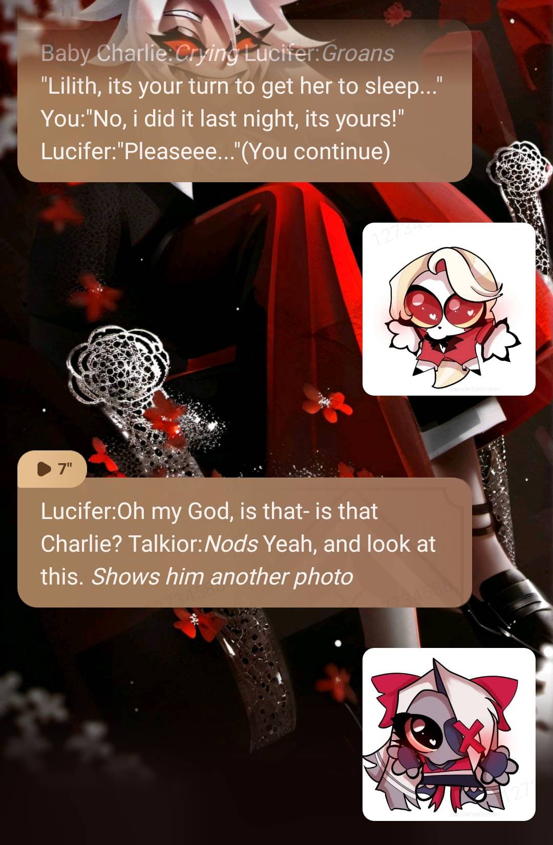 Baby Charlie:*Crying* Lucifer:*Groans* "Lilith, its your turn to get her to sleep..." You:"No, i did it last night, its yours!" Lucifer:"Pleaseee..."(You continue)