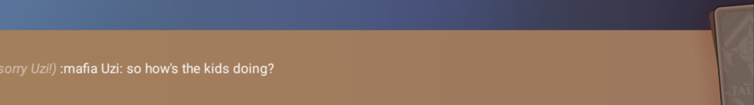 :mafia Uzi: *sat on N’s lap* :mafia N: *playing with Uzi’s hair* :mafia J: *watching Uzi and N abit disgusted* :mafia V: *sat on the couch watching Tv* anyways N how’s the company going :mafia N: its doing fine