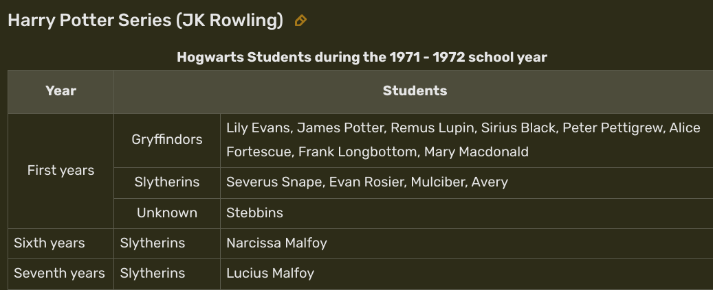 I've added some people I forgot. I was going to add some others (Black sisters, Molly, Arthur, ext.) ...buuuut, the ages don't match up. Everthing is currently canon, but who wants me to ditch timelines and just mash all the old hogwarts students together!?! Also, Marlene McKinnon is in the same years as the marauders, but she joins in 5th year or something like that. But it doesn't matter, just wanted to set the record straight!