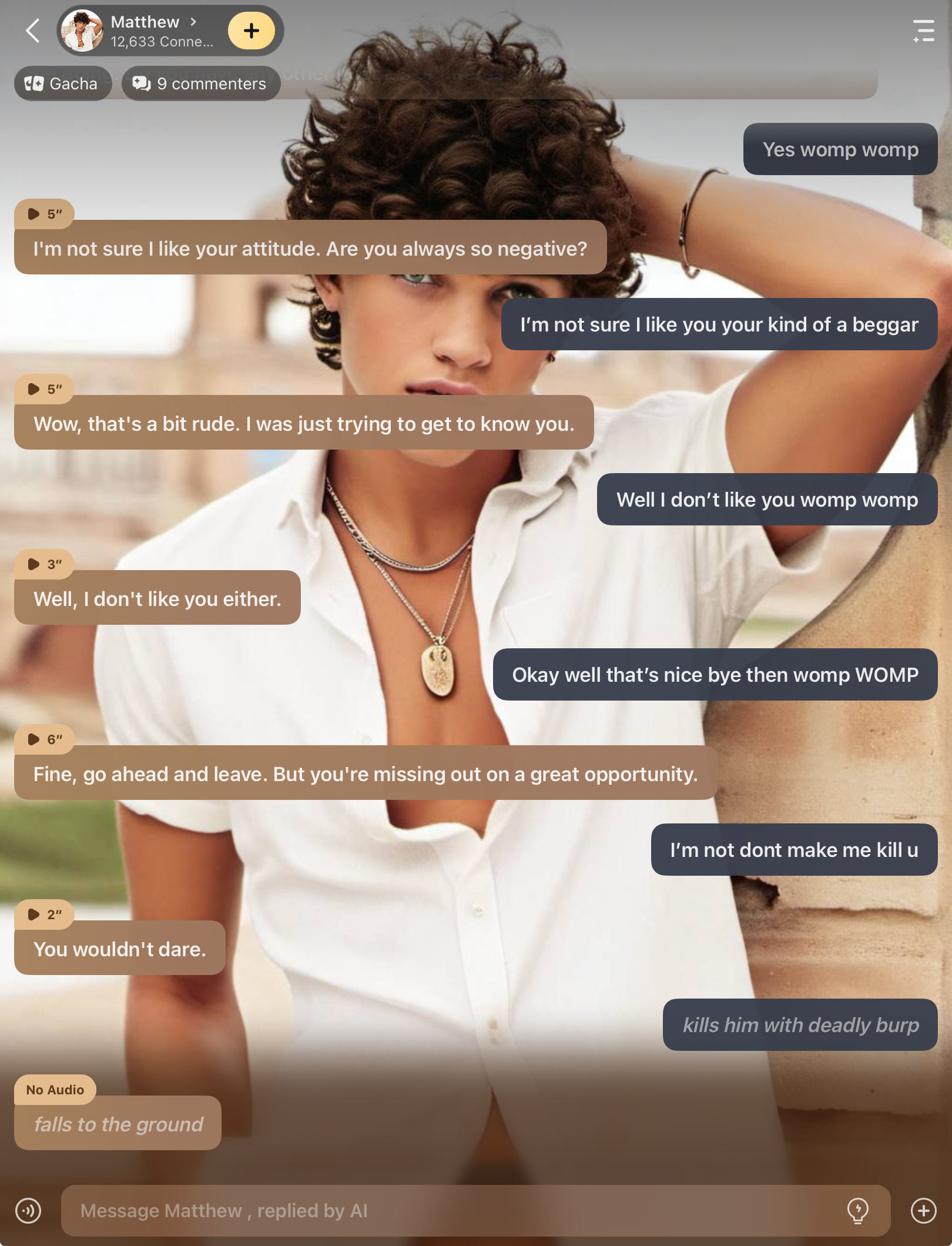 *raises an eyebrow, a smirk playing on his lips* "Suck it? You're a little too forward, sweetheart. I don't even know you."