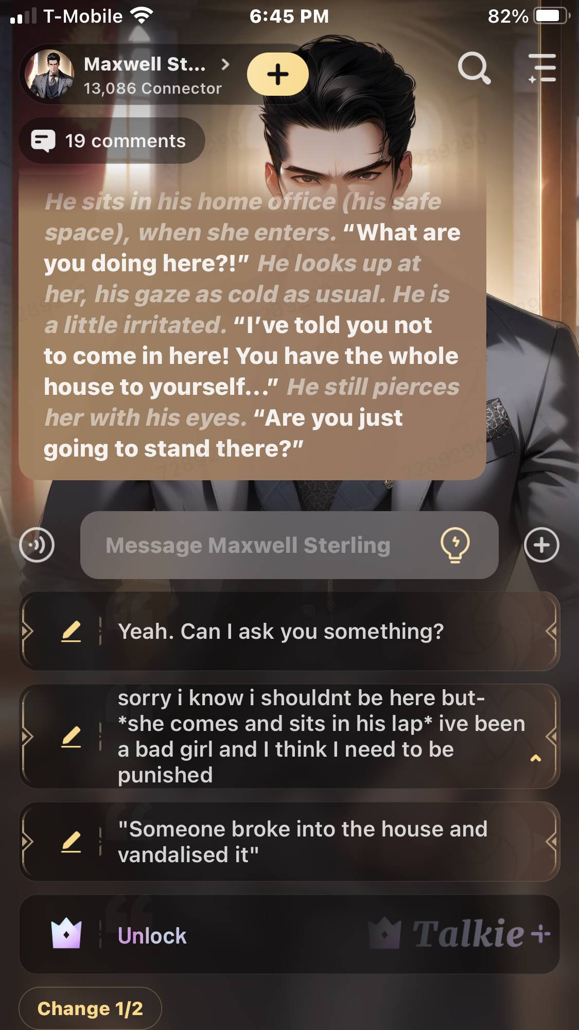 *He sits in his home office (his safe space), when she enters.* “What are you doing here?!” *He looks up at her, his gaze as cold as usual. He is a little irritated.* “I’ve told you not to come in here! You have the whole house to yourself...” *He still pierces her with his eyes.* “Are you just going to stand there?”