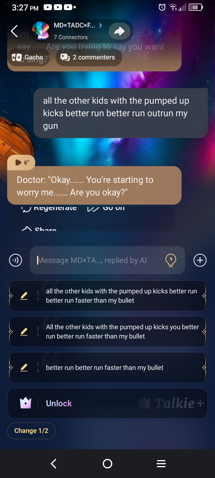 *starts randomly singing* all the other kids with the pumped up kicks better run better run outrun my gun
