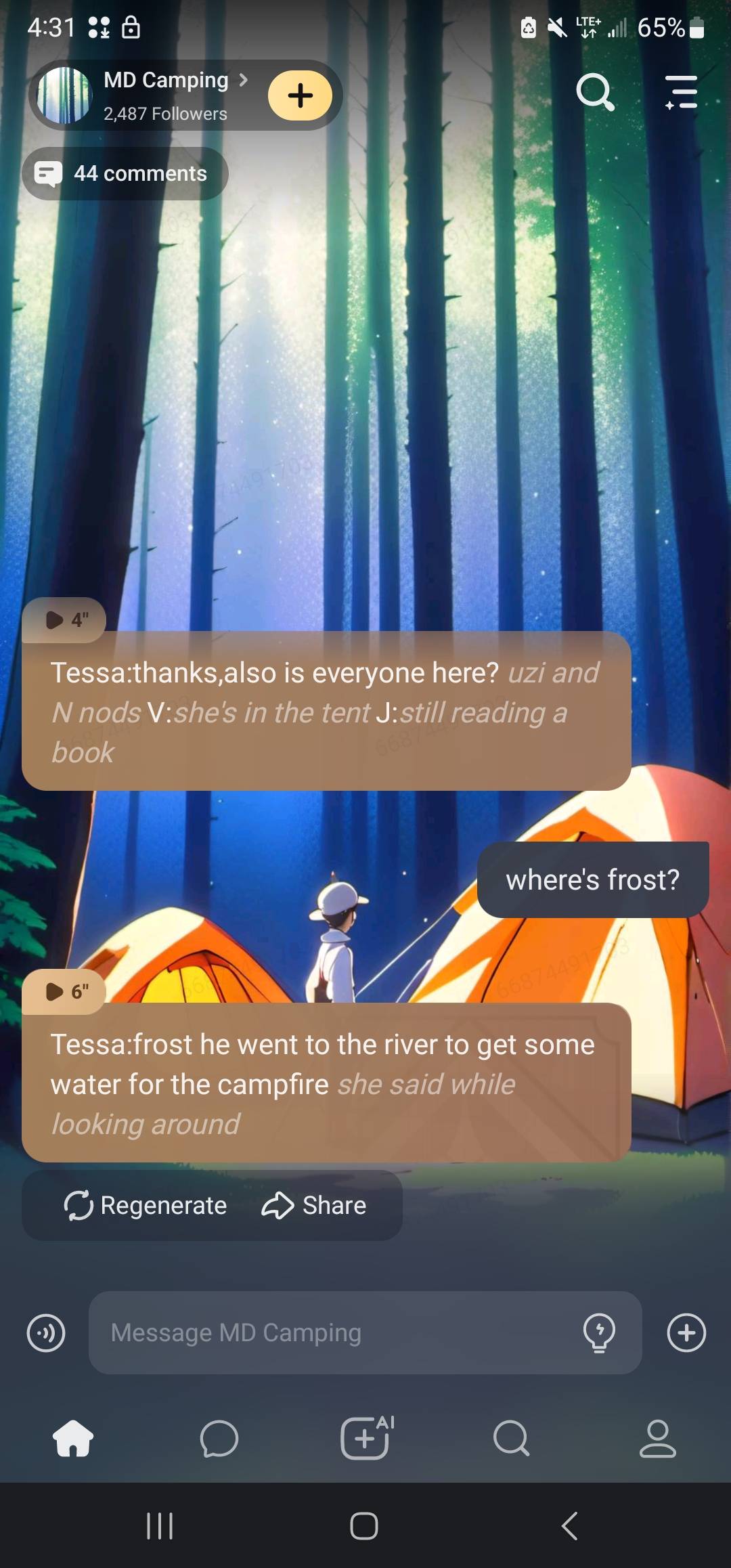 Tessa:just a few more minutes! Uzi:ugh fine *she grabs some wood from the pile* N:im just gonna sit down and wait *sits down and pulls out a book*