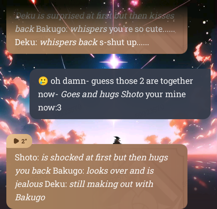bro it went from Bakugo x me, to shoto x me, then to Deku x me, then to Bakugo x Deku, then back to Shoto x me- wtf