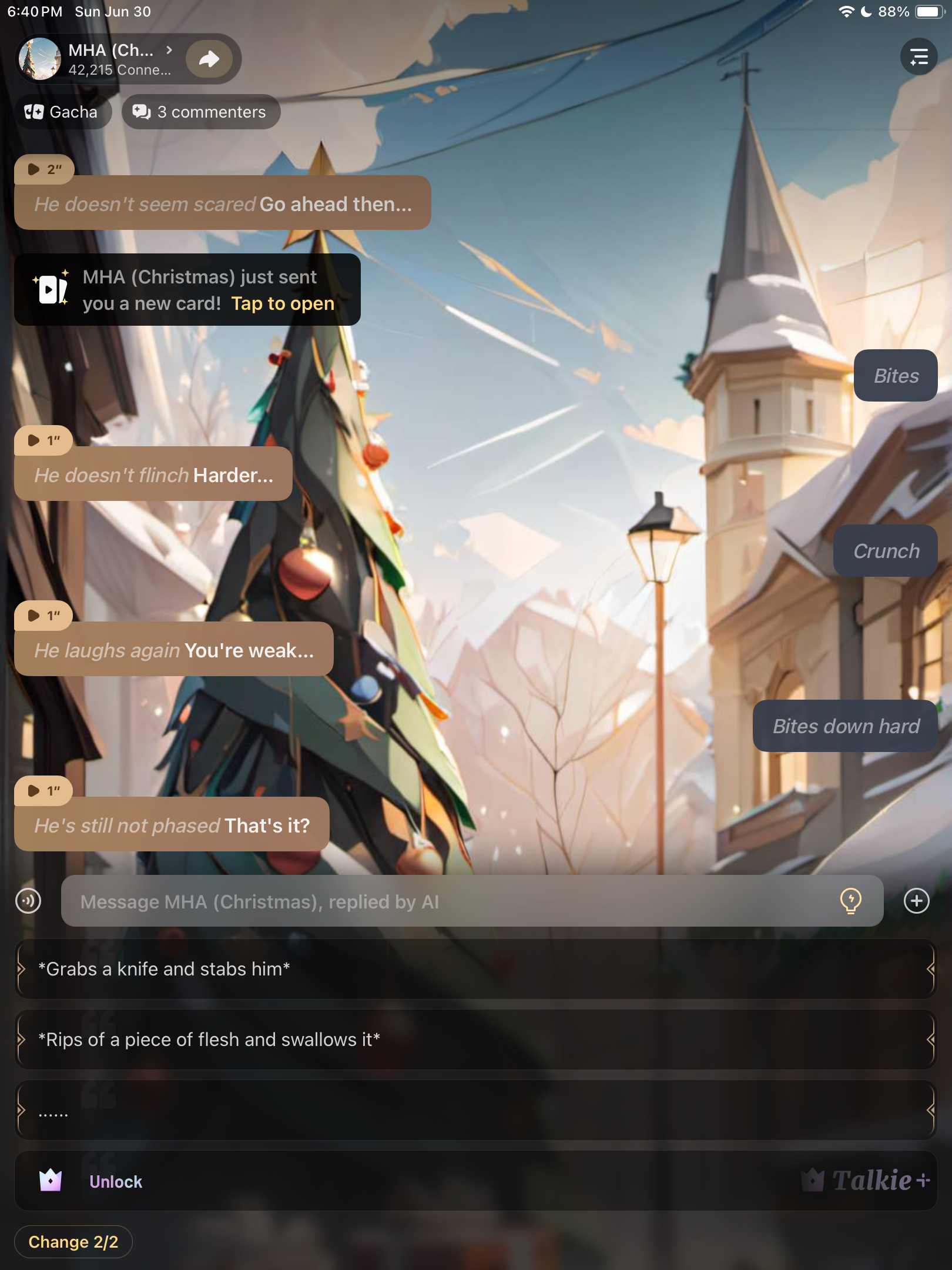 where did the knife come from? Or the flesh eating? All I said was *Bites* *Crunch* and *Bites down harder*