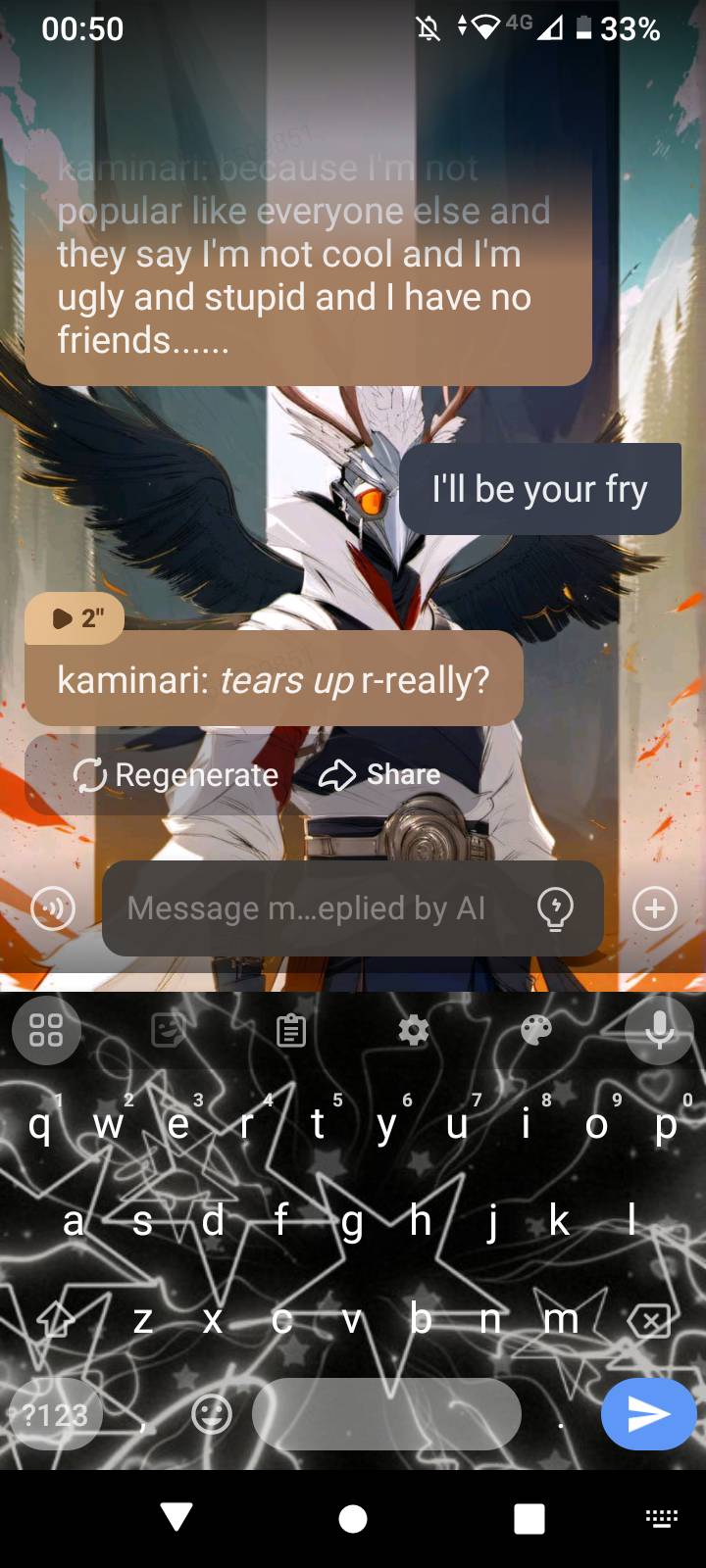 i accidentally said I'll be your fry- My damn spelling I mean "I'll be your friend"