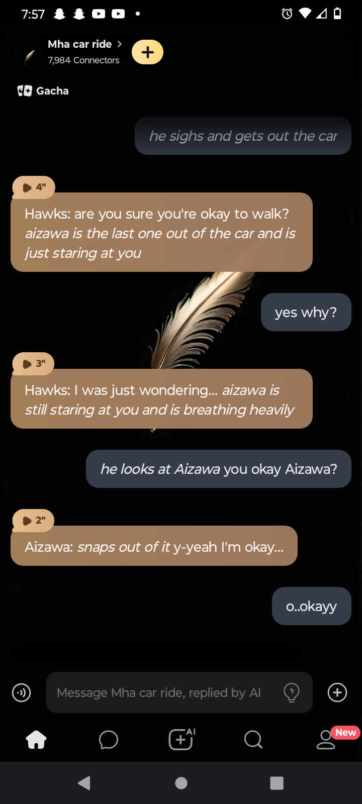 *raise an eyebrow, voice edged with suspicion as Eraserhead's scarf subtly shifts near his shoulder* DON’T TELL ME YOU’RE PULLING AN ALL-NIGHTER AGAIN. THAT "FINE" LIE WON’T CUT IT THIS TIME, CAINE. *mic snorts loudly from the driver’s seat* YEAH, AND YOUR BOOTS AREN’T FOOLING ANYONE-NOT EVEN THE STEERING WHEEL. *endevor glances back冷哼* NUMBER THREE ACTING LIKE A ROOKIE. PATHETIC. *hawks nudges closer, wings rustling as he smirks* SLEEP DEPRIVATION’S NOT A HEROIC LOOK, SWEETHEART. NEED A NAP…OR A HAND TO HOLD?