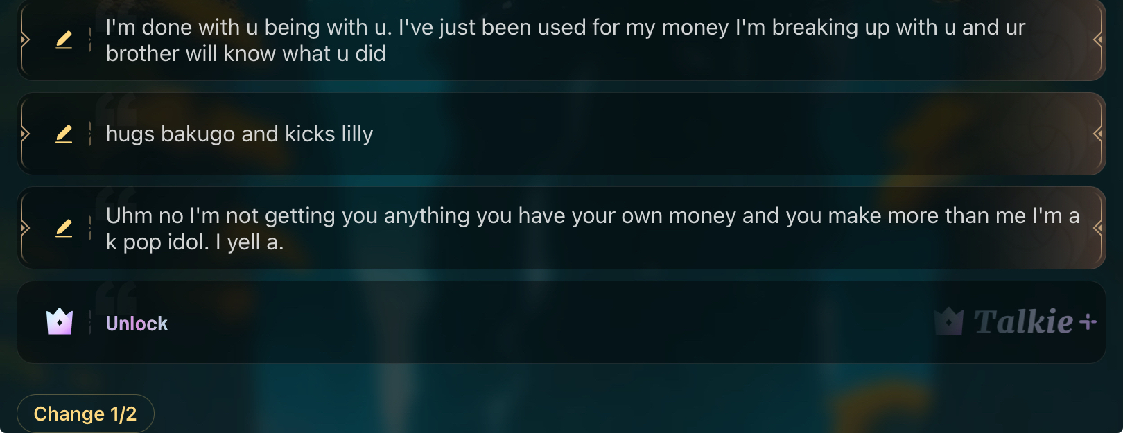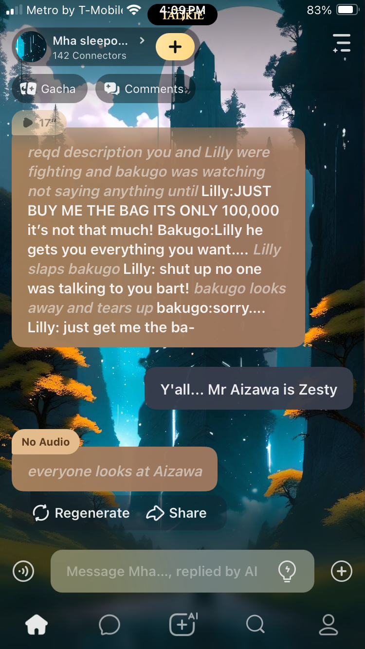 I like this one a lot I dumped Lilly said I was bi before she left then I told Bakugo I was bi but then soon realized I was gay then got with Bakugo❤ I'm probably going to follow this talkie. I like it.