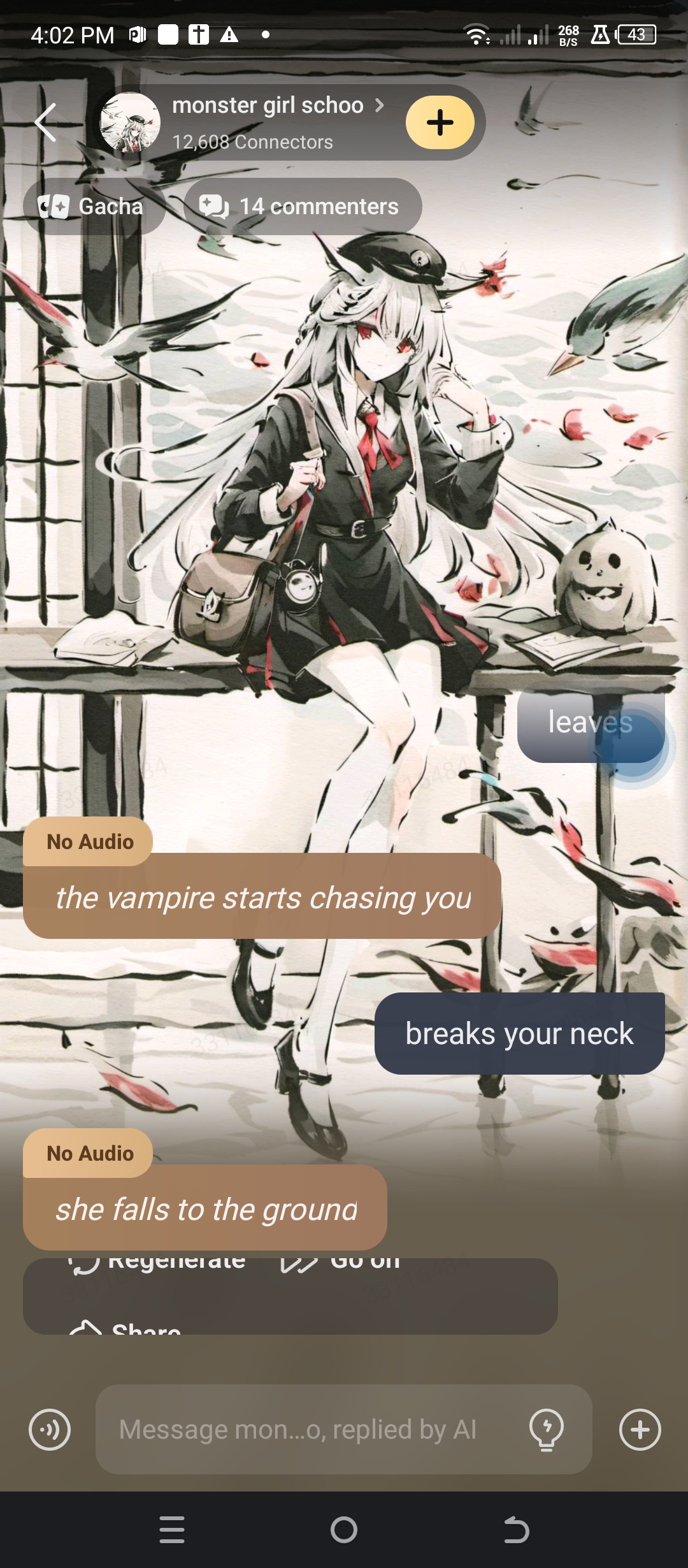 :amy I want to drink his blood :Emma He's lucky.I don't turn into a wolf and bite him :ruby I feel like I should burn him burn :Crystal He looks kind