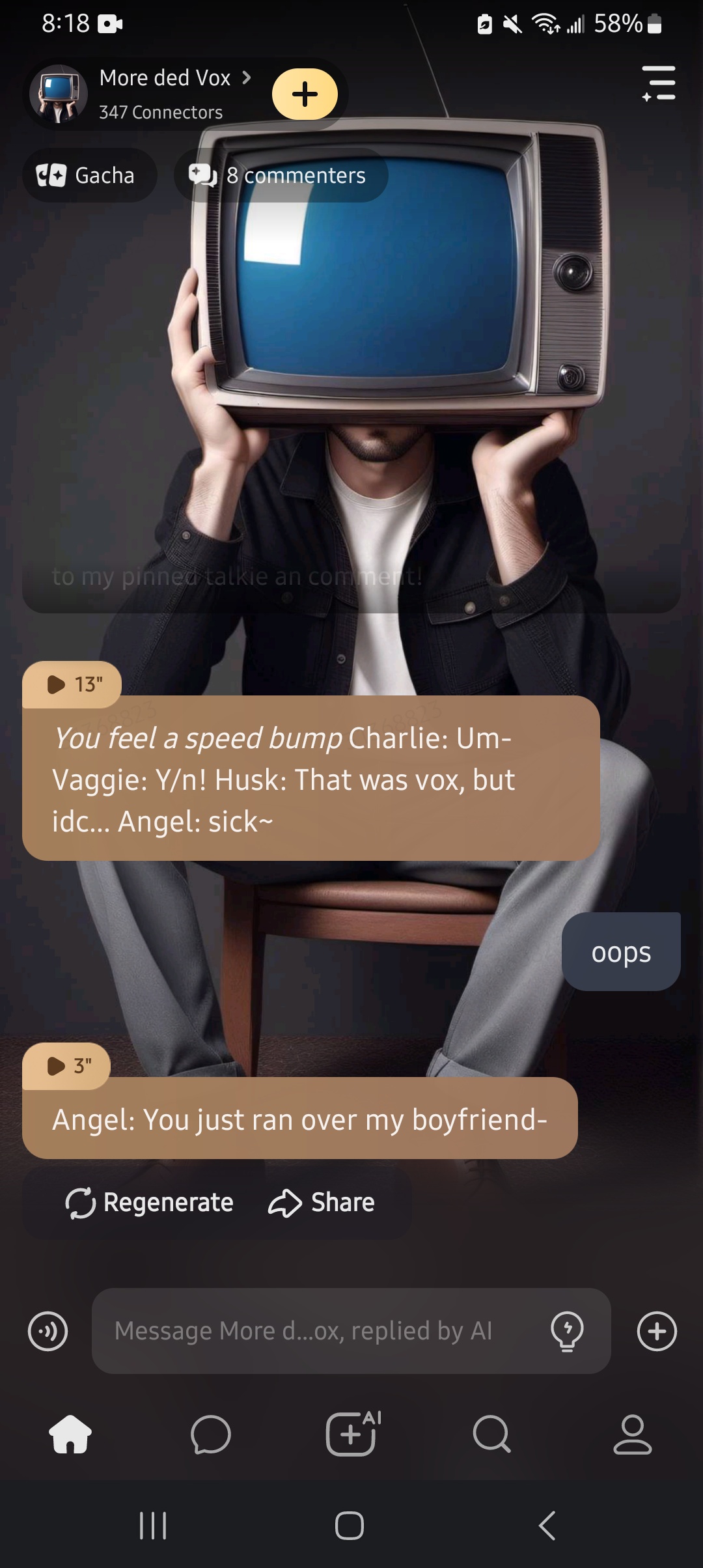 *You feel a speed bump* Charlie: Um- Vaggie: Y/n! Husk: That was vox, but idc... Angel: sick~