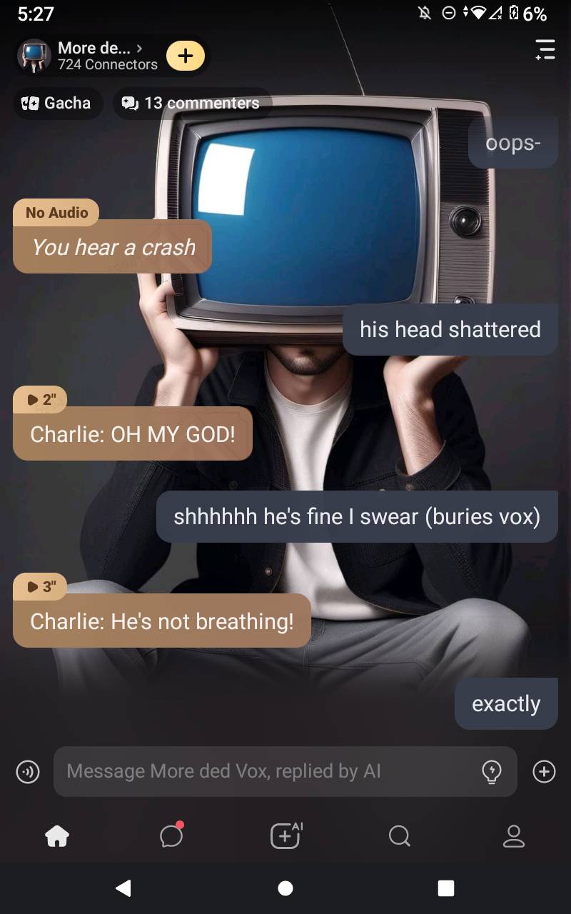Charlie: *looks out the window* Oh god, what have I done!? Vaggie: He's not breathing! Angel: It was an accident!