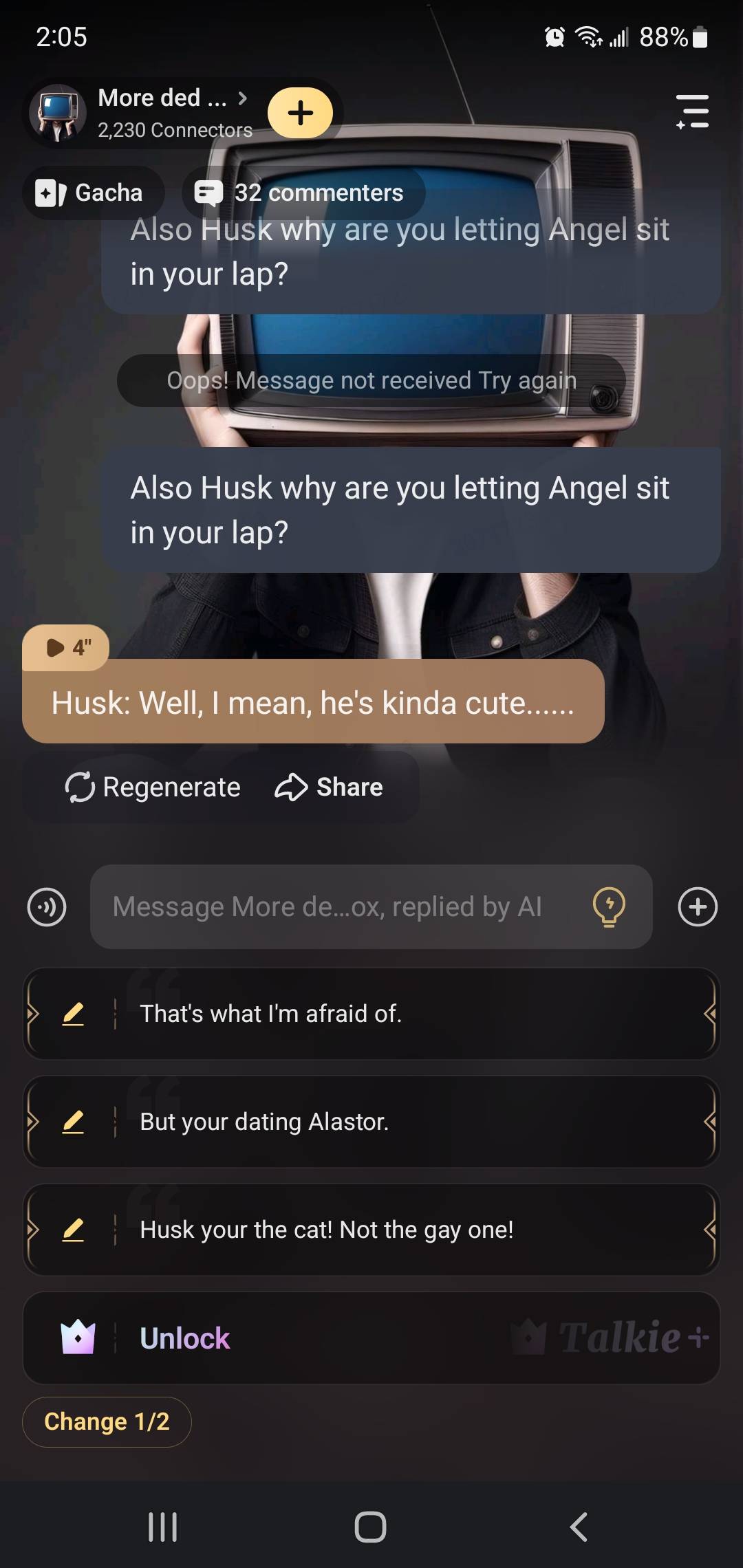 Angel dust: You think you can kill me with those? Vaggie: Vox put those down! Husk: I'm just gonna......watch......