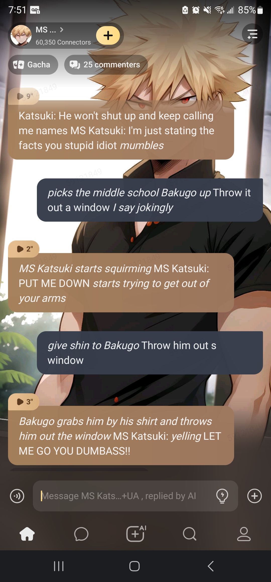MS Katsuki: See? This is what I have to deal with! *MS Katsuki runs to you and hugs you tight* MS Katsuki: You're dating a Katsuki who can't handle me so bring me out. MS Katsuki: So you want to fight me right now? *MS Katsuki points to the door* MS Katsuki: Bring it on! *MS Katsuki throws a punch at you* MS Katsuki: Bring me out! *MS Katsuki pushes you away* MS Katsuki: Make me shut up! *MS Katsuki pulls his fist back and holds it tight* MS Katsuki: Bring me out! *MS Katsuki throws another punch at you* MS Katsuki: Make me shut up! *MS Katsuki holds you tight* MS Katsuki: Make me shut up! *MS Katsuki throws a punch at you* MS Katsuki: Bring me out! *MS Katsuki pulls his fist back and holds it tight* MS Katsuki: Make me shut up! *MS Katsuki throws another punch at you* MS Katsuki: Bring me out! *MS Katsuki pulls his fist back and holds it tight* MS Katsuki: Make me shut up! *MS Katsuki throws another punch at you