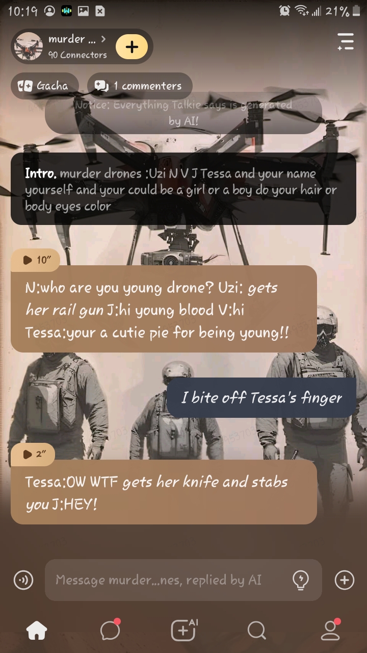 N:who are you young drone? Uzi: *gets her rail gun* J:hi young blood V:hi Tessa:your a cutie pie for being young!!
