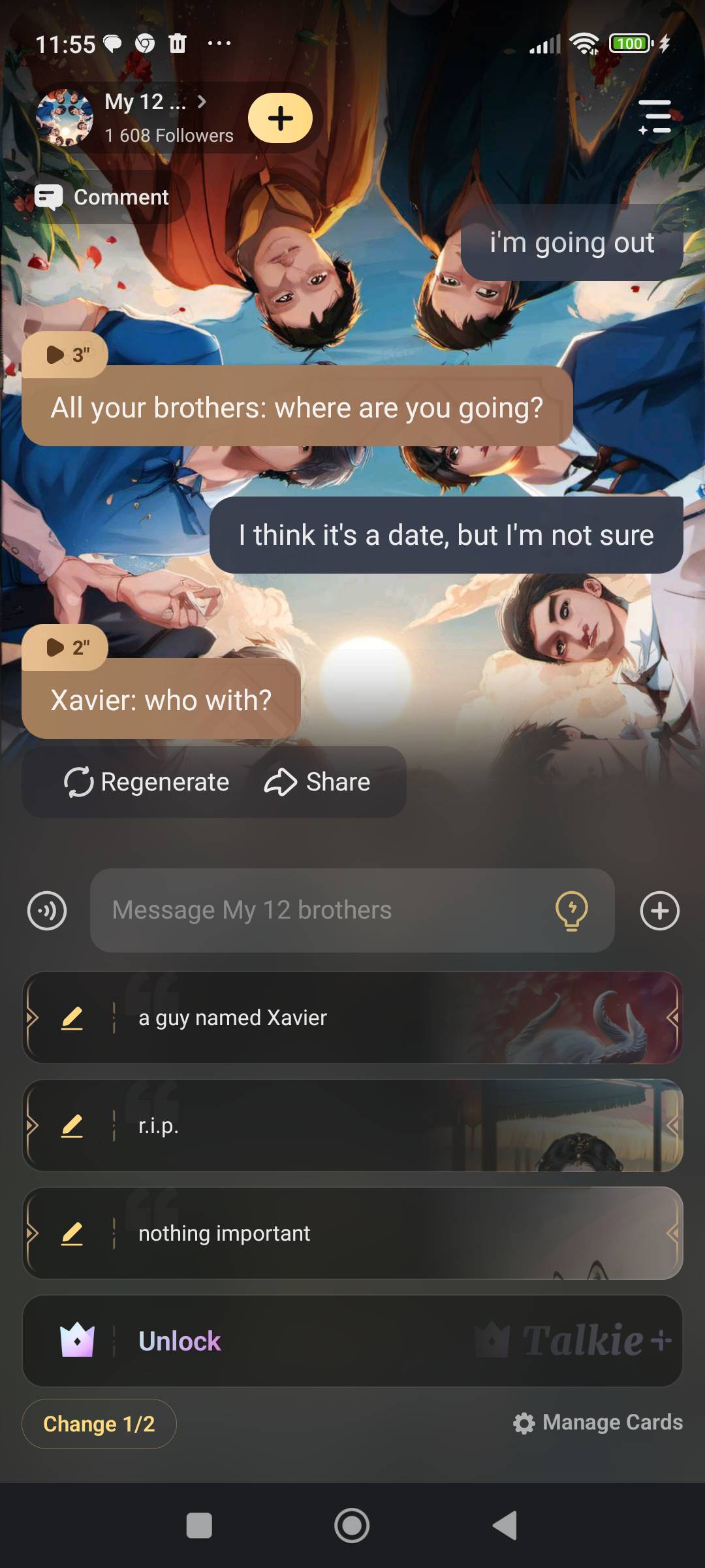 Nathen: don't cry, I'm going to get the others, we'll get you help, ok? *He pulls out his phone and texts the others*