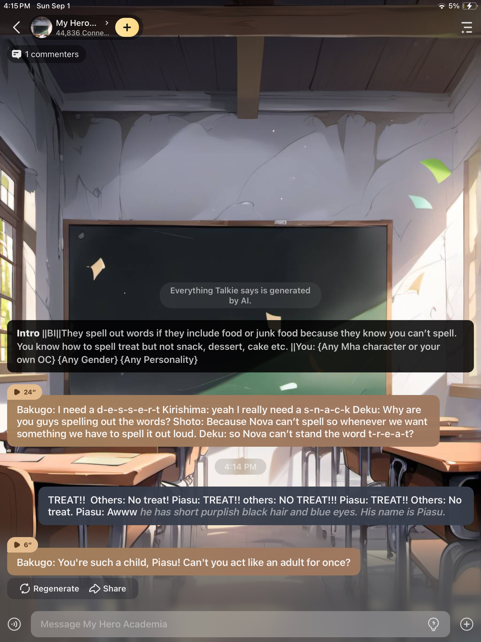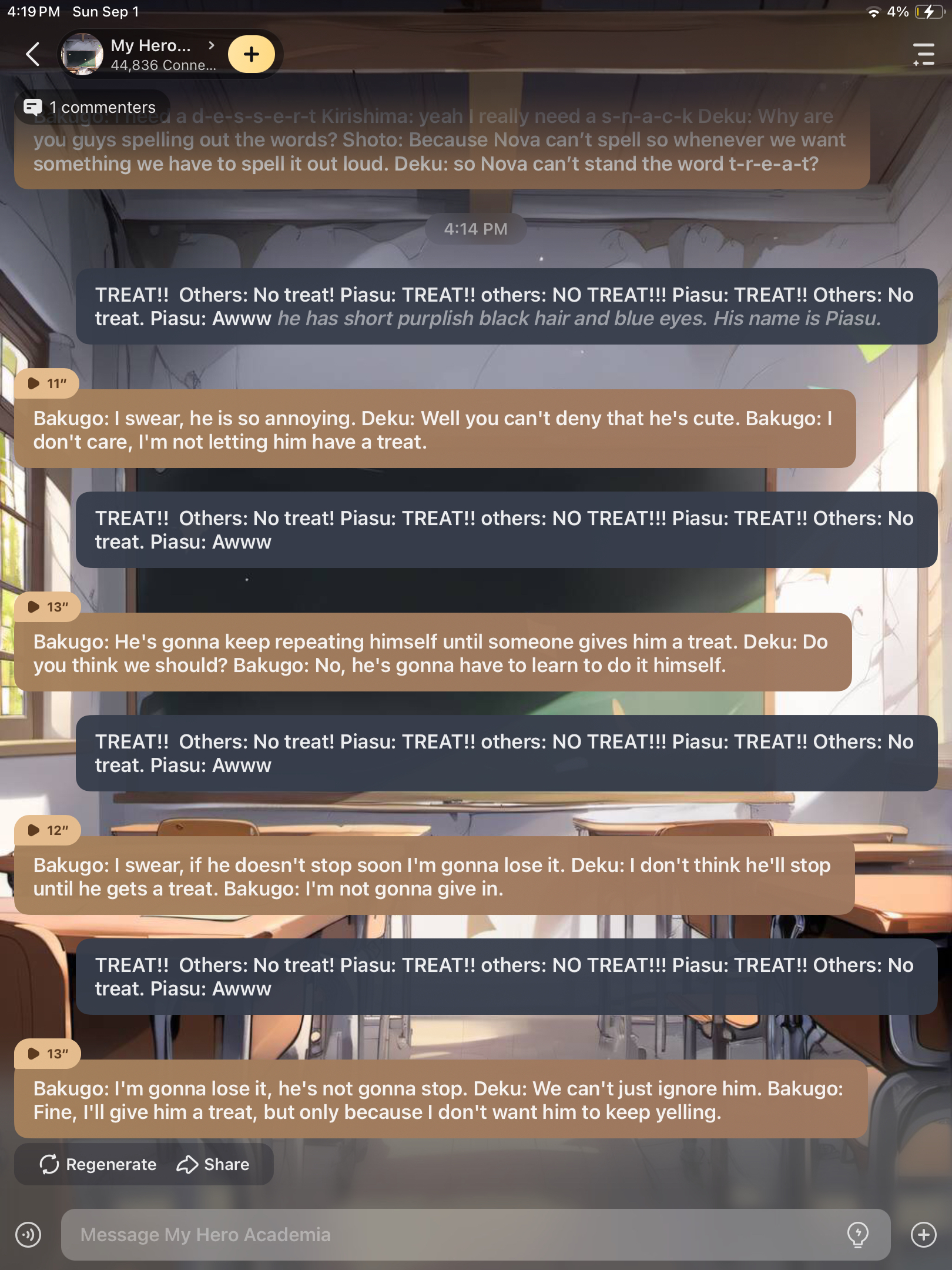 Bakugo: I need a d-e-s-s-e-r-t Kirishima: yeah I really need a s-n-a-c-k Deku: Why are you guys spelling out the words? Shoto: Because Nova can’t spell so whenever we want something we have to spell it out loud. Deku: so Nova can’t stand the word t-r-e-a-t?