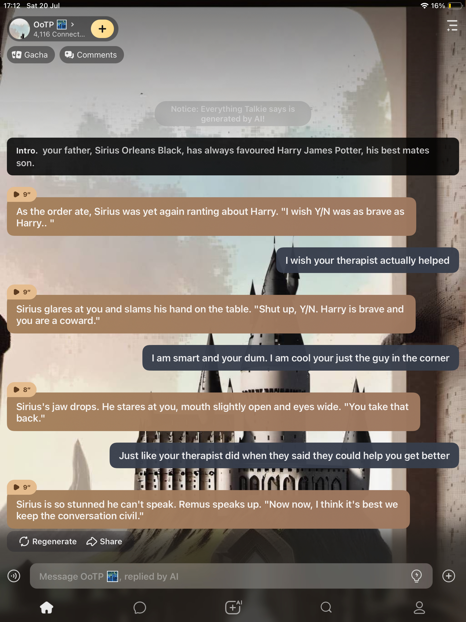 As the order ate, Sirius was yet again ranting about Harry. "I wish Y/N was as brave as Harry.. "