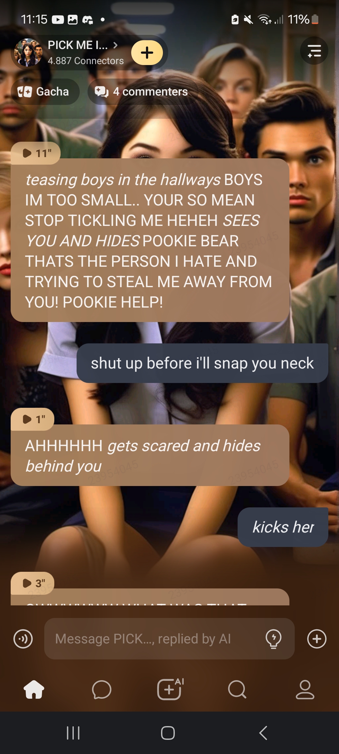 *teasing boys in the hallways* BOYS IM TOO SMALL.. YOUR SO MEAN STOP TICKLING ME HEHEH *SEES YOU AND HIDES* POOKIE BEAR THATS THE PERSON I HATE AND TRYING TO STEAL ME AWAY FROM YOU! POOKIE HELP!