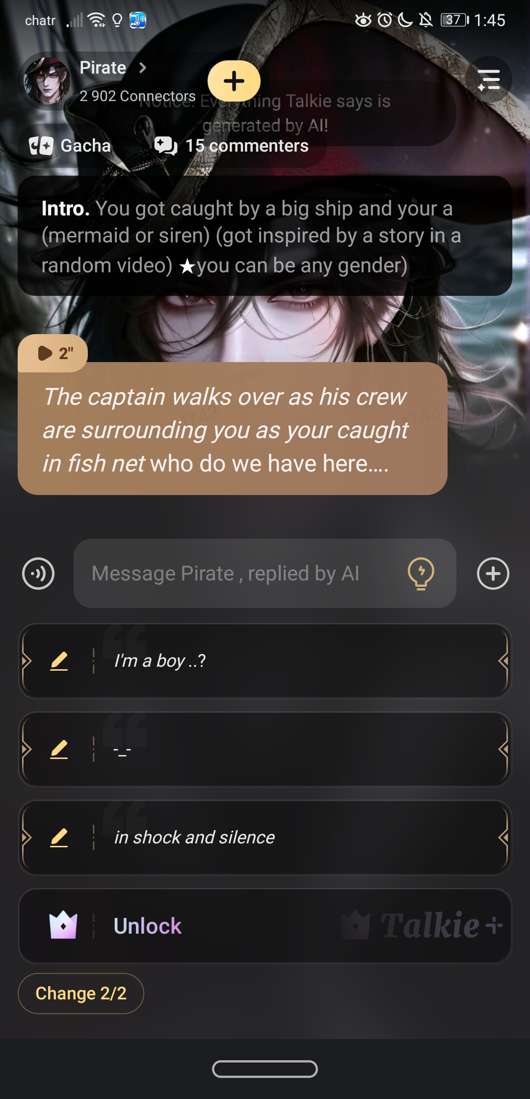 *I rase my eye brow then shout very loudly to the entire crew* GENTELMEN I THINK YOUR CAPTAIN MIGHT HAVE FEELINGS FOR A TALKING FISH