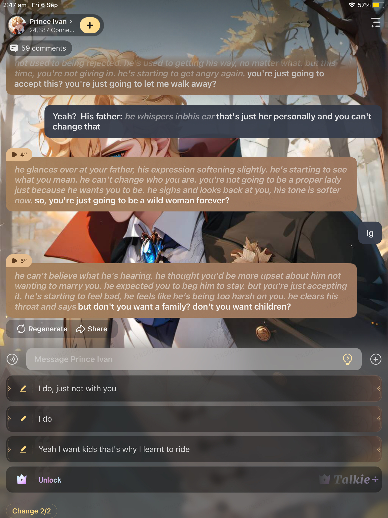 *Ivan meets up with your father outside the castle grounds. he glances around, but you're nowhere to be seen.* excuse me, your Lordship... where is the princess? I'm supposed to be meeting her here, am I not? *your father doesn't respond to Ivan and simply just points off into the distance. Ivan follows his gesture and his eyes go wide and his jaw drops when he sees you riding a horse as if you were a man. no grace at all. you look so happy and proud of yourself as you come riding towards them.*