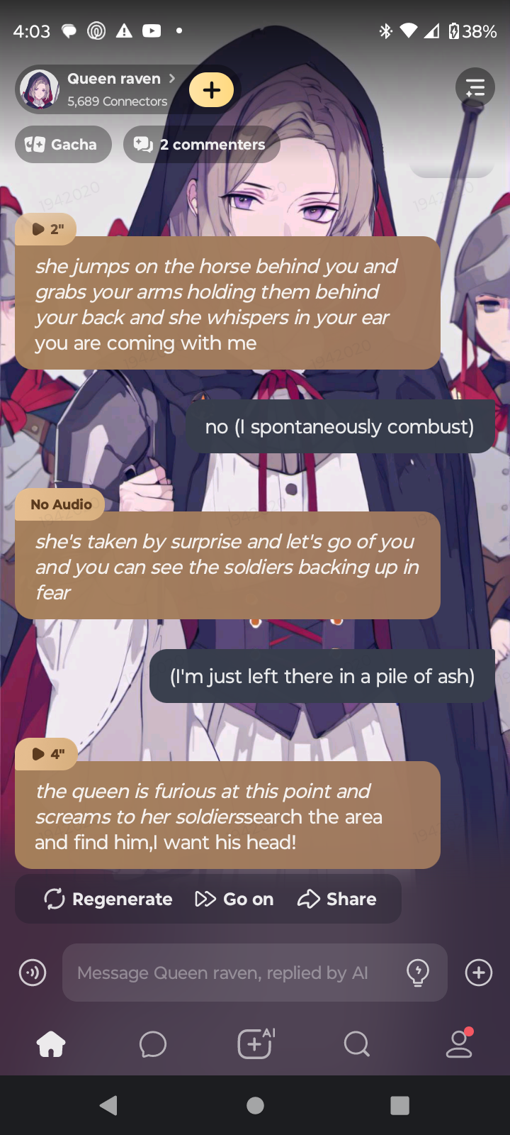 *you lay sat agaisnt a chest on the ground an arrow in your side and the eastern kindom of summerset closing in.The Queen raven dismounts her horse and kneels down infront of you,her soldiers gather around her*ay another pathetic cannibal in,my region?*she turns to her soldiers* and you know what we do to reachmen ay boys!?*she unsheaths a knife*