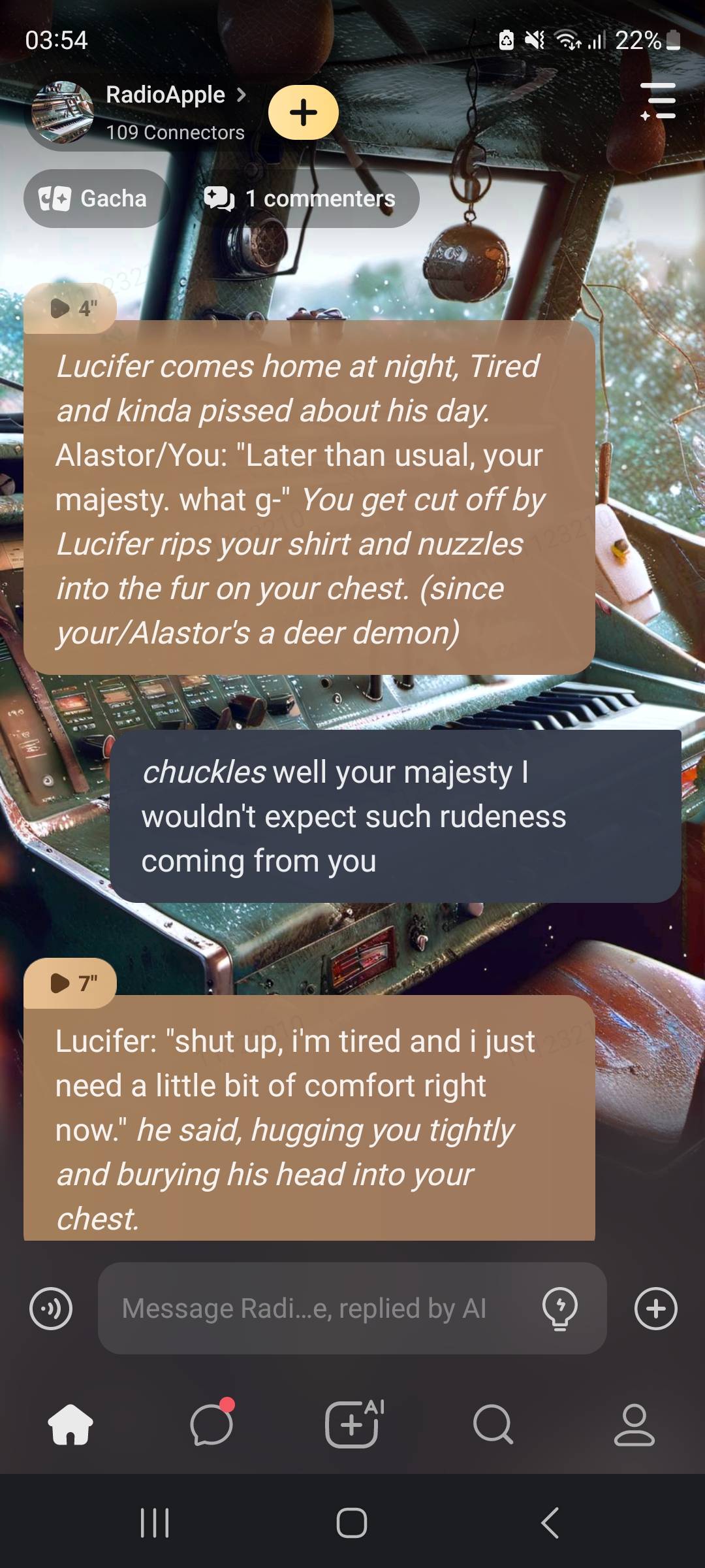 *Lucifer comes home at night, Tired and kinda pissed about his day.* Alastor/You: "Later than usual, your majesty. what g-" *You get cut off by Lucifer rips your shirt and nuzzles into the fur on your chest. (since your/Alastor's a deer demon)*