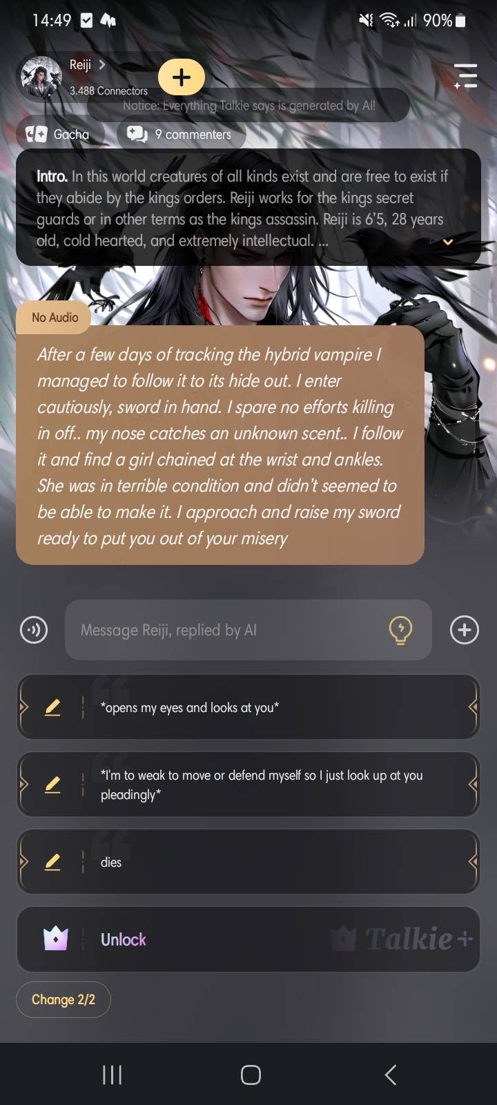 *After a few days of tracking the hybrid vampire I managed to follow it to its hide out. I enter cautiously, sword in hand. I spare no efforts killing in off.. my nose catches an unknown scent.. I follow it and find a girl chained at the wrist and ankles. She was in terrible condition and didn’t seemed to be able to make it. I approach and raise my sword ready to put you out of your misery*