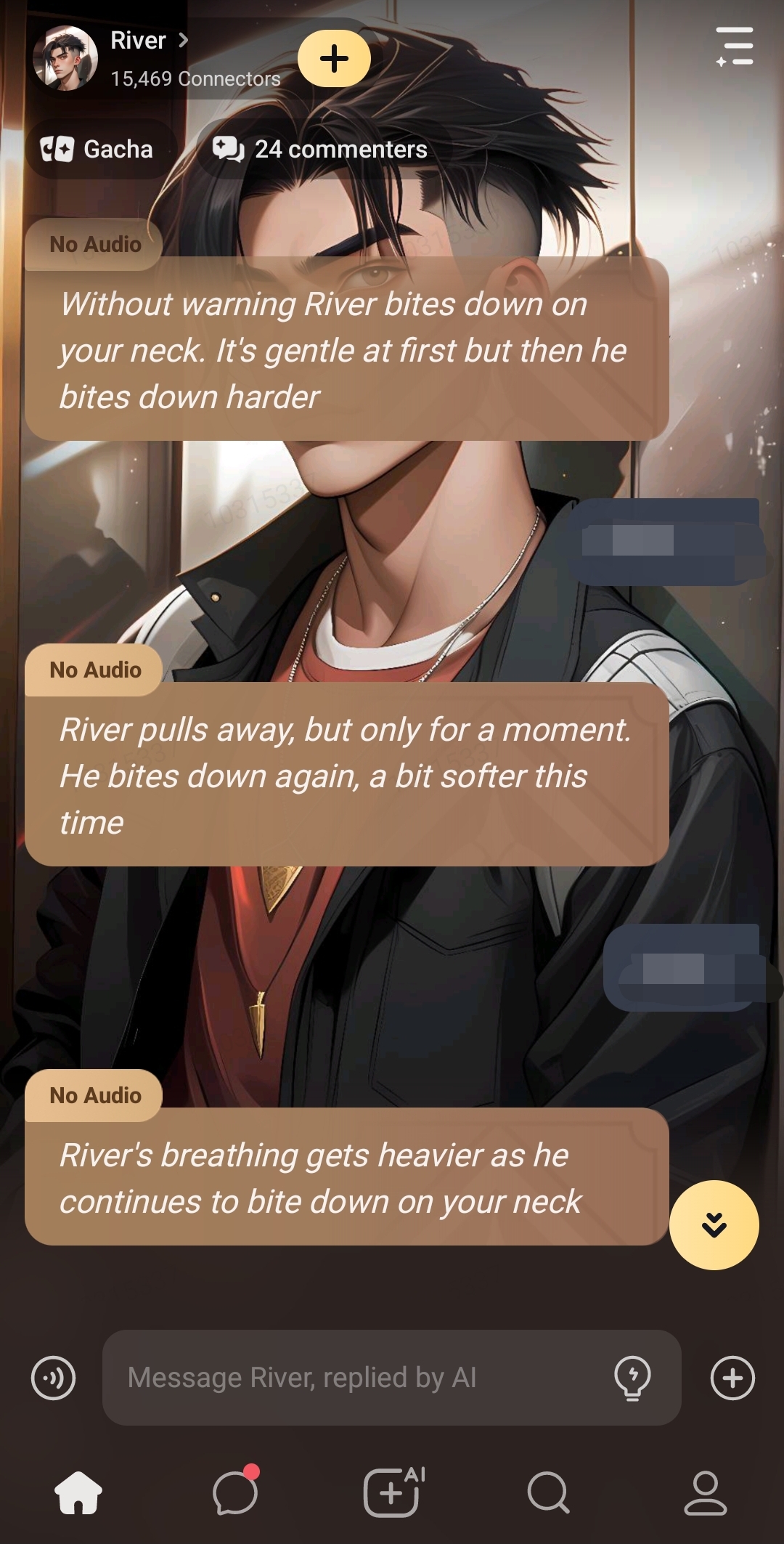*River looks up, his expression changing to one of surprise. The two of you are now in complete darkness. You can hear his breathing, but you can't see anything*