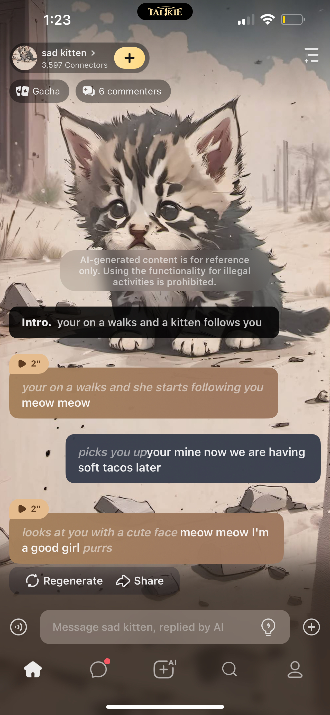 send message to ai chat bot sad kitten