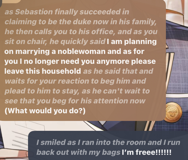 *as Sebastion finally succeeded in claiming to be the duke now in his family, he then calls you to his office, and as you sit on chair, he quickly said* I am planning on marrying a noblewoman and as for you I no longer need you anymore please leave this household *as he said that and waits for your reaction to beg him and plead to him to stay, as he can't wait to see that you beg for his attention now* (What would you do?)