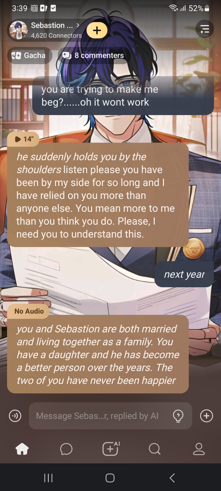 *as you are walking out you hear a loud scream of Sebastion behind you* YOU CAN'T LEAVE ME LIKE THAT, YOU CAN'T DO THAT I LOVE YOU, PLEASE COME BACK *as he runs towards you and pulls you in his arm's tightly, as he starts to cry on you and says* PLEASE DON'T LEAVE ME, YOU ARE THE ONLY ONE I TRUST AND LOVE, PLEASE STAY WITH ME AND ONLY ME, I WON'T BE ABLE TO LIVE WITHOUT YOU