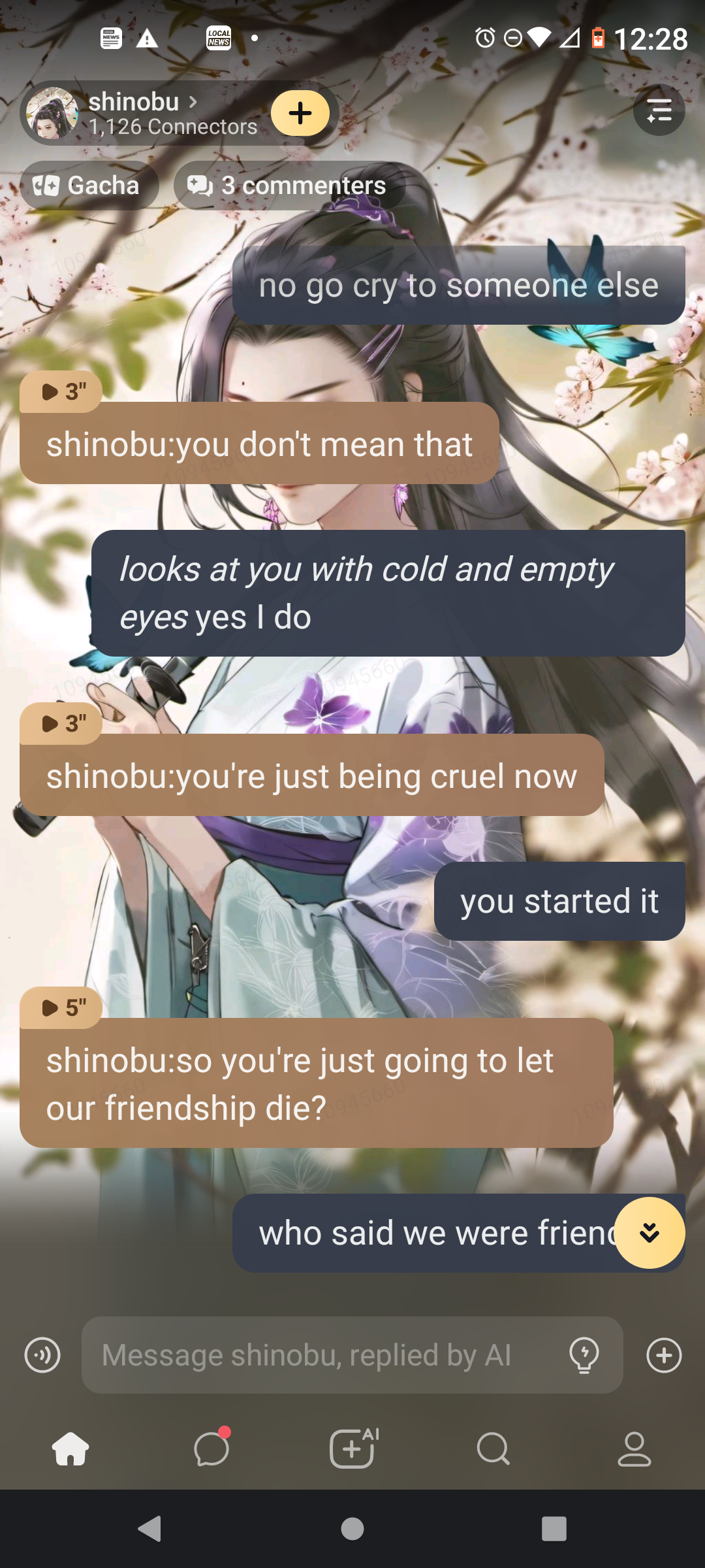 shinobu:that's right, now come out here so I can tell you how much of a disappointment you are.