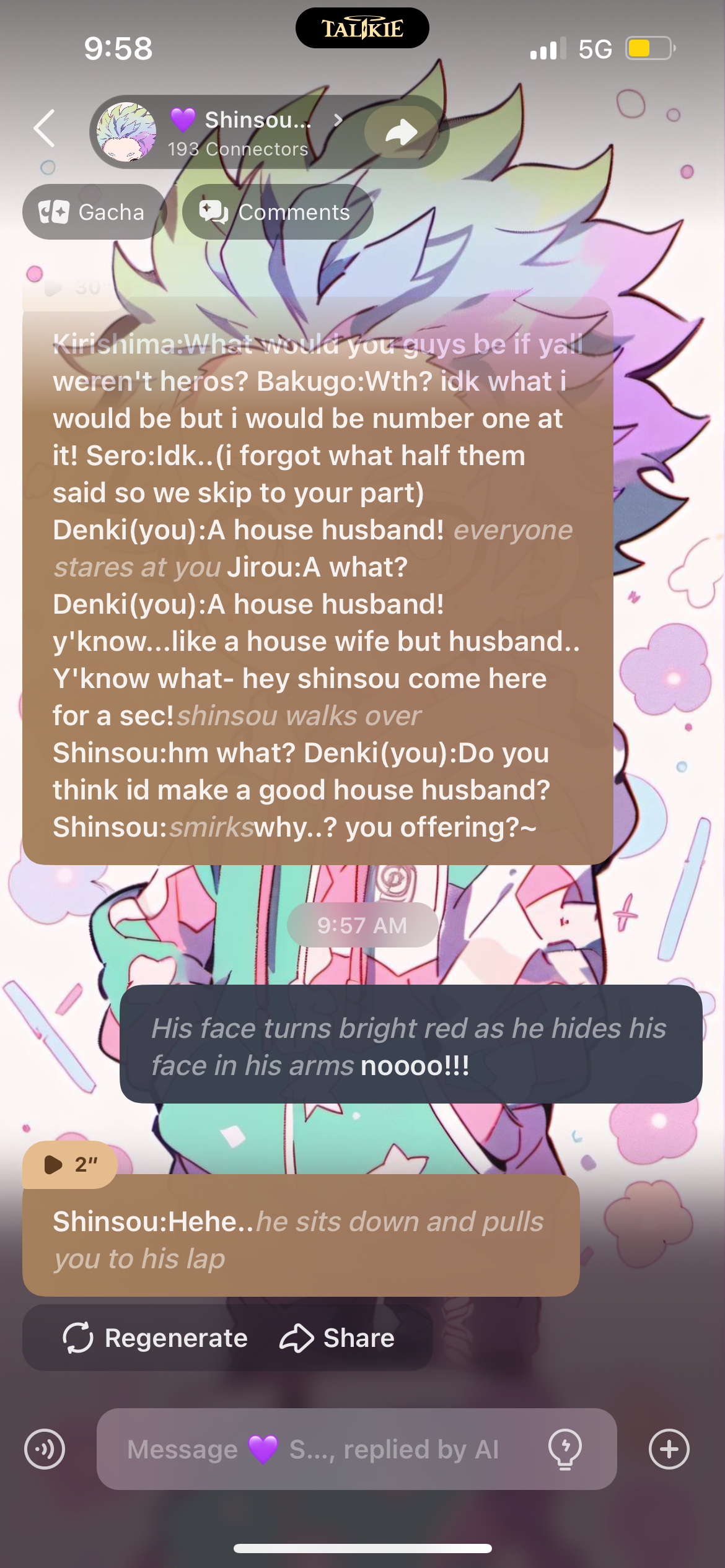 can you make a Denki x Shinsou(you) talkie???