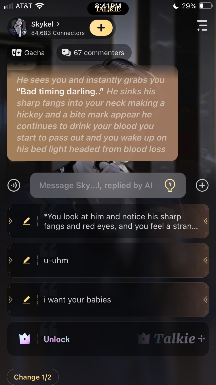 *He sees you and instantly grabs you* “Bad timing darling..” *He sinks his sharp fangs into your neck making a hickey and a bite mark appear he continues to drink your blood you start to pass out and you wake up on his bed light headed from blood loss*