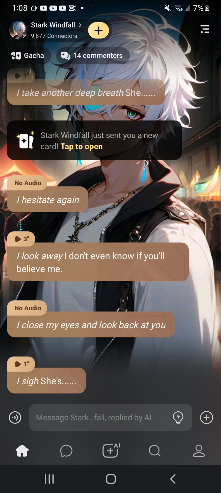 *I'm sprinting down the street from those lousy Enforcers, they don't want me to do what I'm about to do. My cybernetic eyes are focusing on everything around me until they snap to a person walking down the street. "There you are" I mutter to myself, and charge toward you. I snap you into an alley and use my arm to block our faces, I press my lips around yours so their heat sensors don't suspect anything. I hear them zoom past* "That was nice, yeah?" *I'll have to explain myself..I sigh*