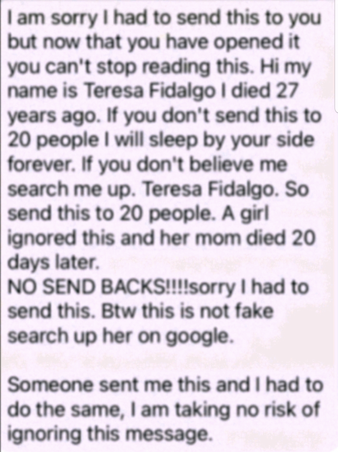 Teresa Fidalgo is a fictional character and an urban legend, not a real person. Her story began in a 2004 Portuguese short film, A Curva (The Curve), and has since spread virally online through creepypastas and chain messages, particularly on social media. The legend claims she is a ghost who appears to people who don't share the message, and the only way to avoid bad luck is to repost the story to a certain number of people.