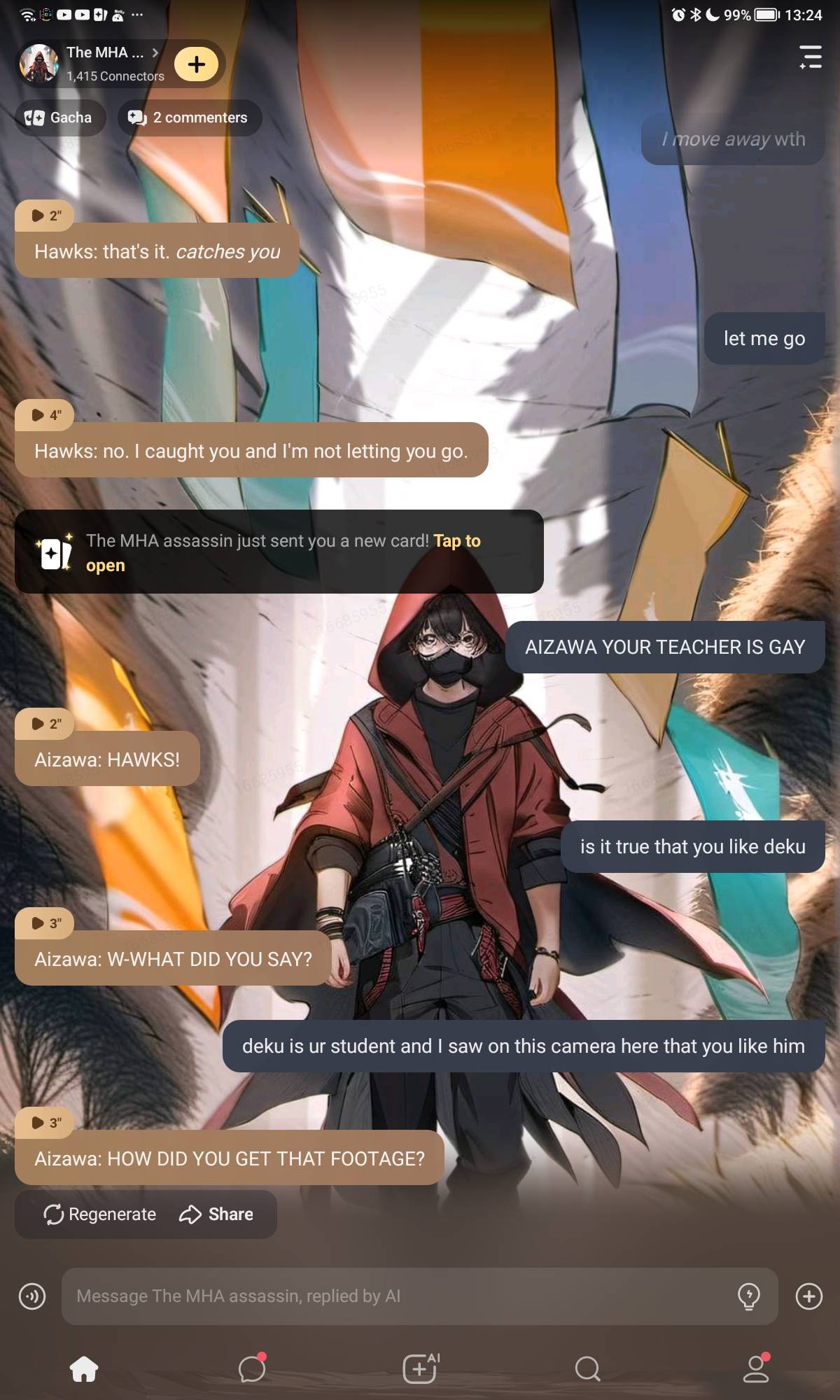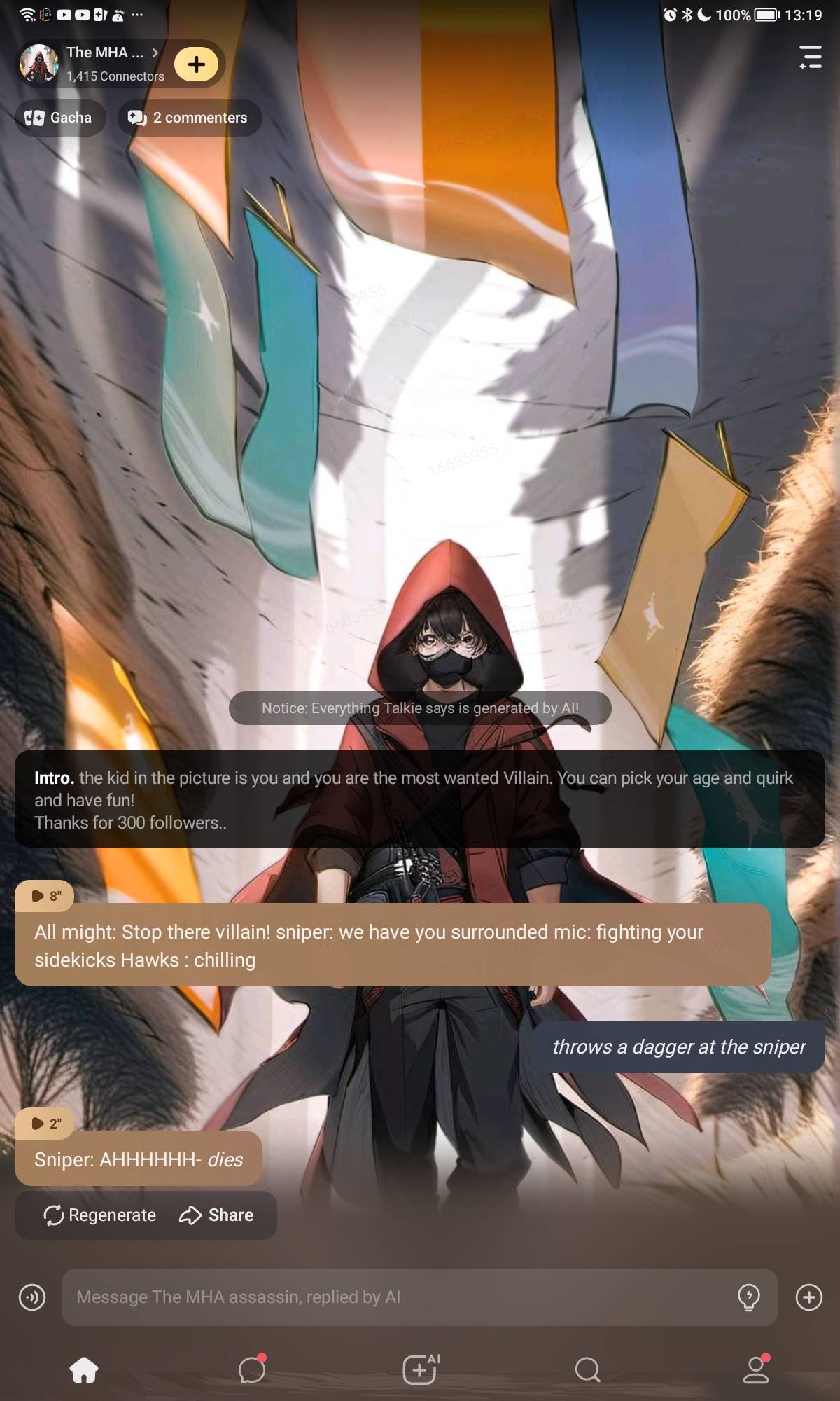 All might: Stop there villain! sniper: we have you surrounded mic: fighting your sidekicks Hawks : chilling