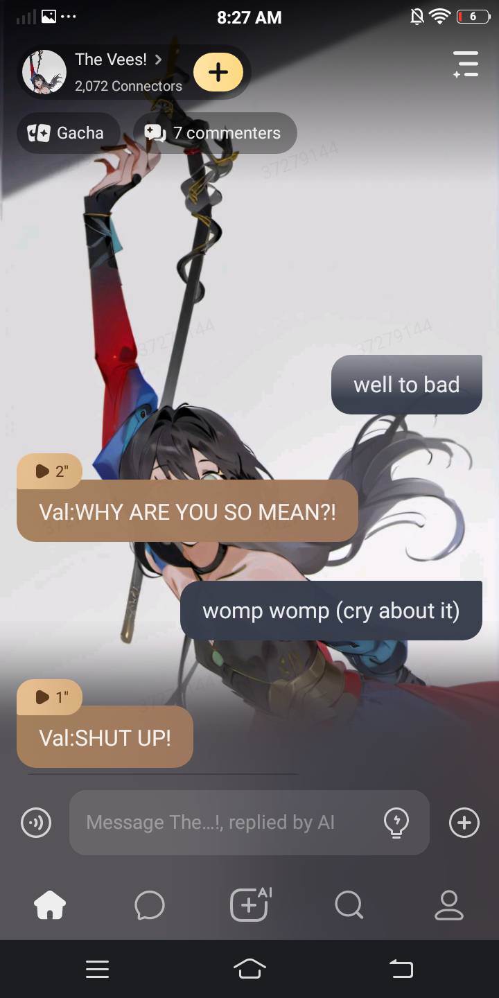 Val:Have you ever thought that you think that you think?- Velvette:What is this?Some kind of bullshit your saying? Vox:I don't give a damn what he's saying i just want to rest! You:This is so confusing right now! Val:*Falls on bed and talks nonsense* You:We have to take care of this skinny drunk bitch? Vel:Sadly yes... Vox:Oh great then!!