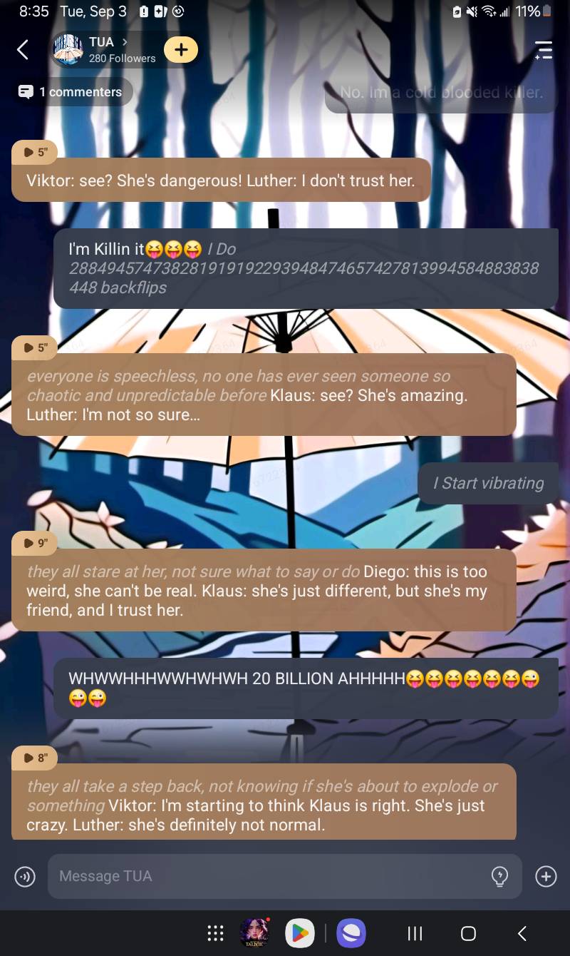 Five: really? Allison: oh my gosh, you're single? Luther: that's surprising. Ben: you seem like the kind of girl who would have a lot of guys chasing after her. Diego: I would if I wasn't already in a relationship.