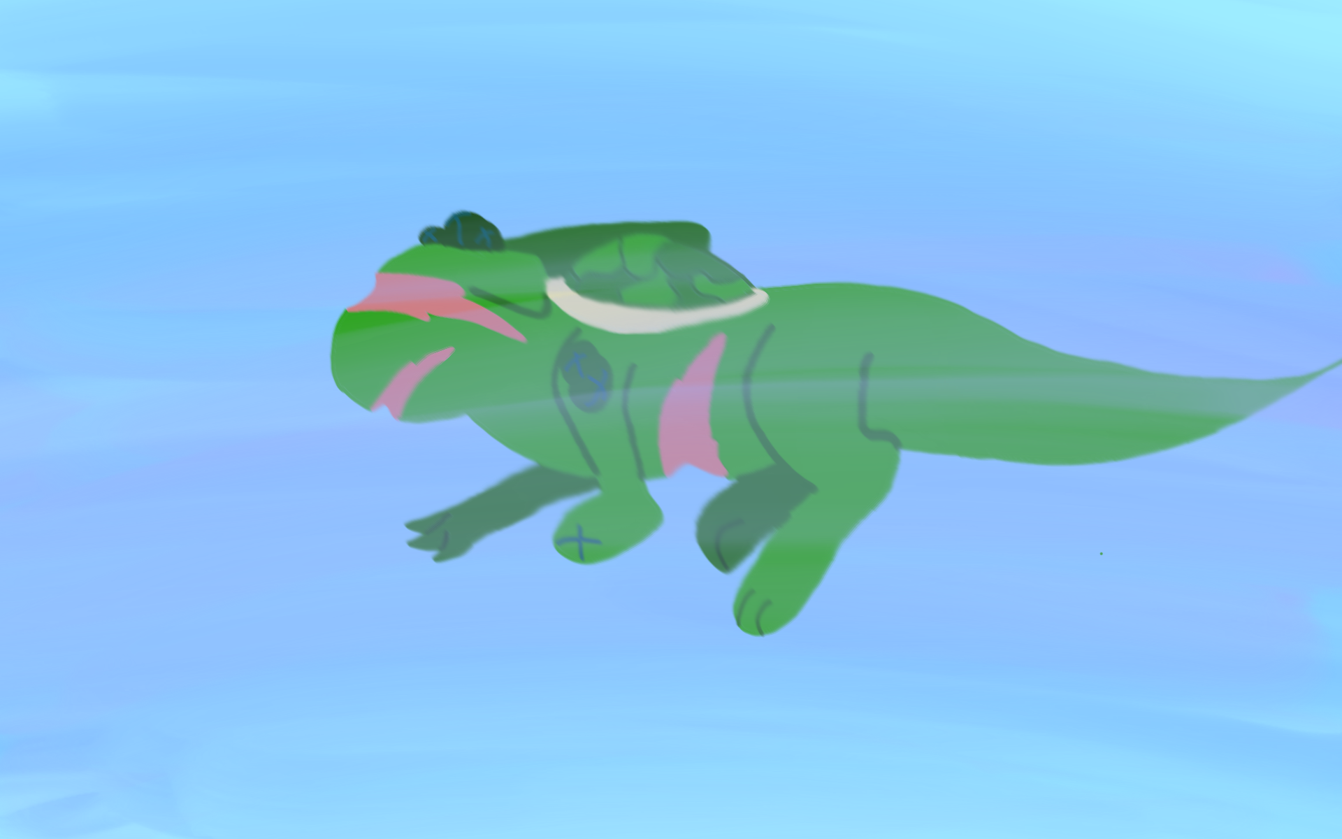 *Turtle's eyes widen in surprise when the slugcat suddenly appears. They stare at it for a moment, trying to decide what to do. Should they try to talk to it, or should they just run away?*