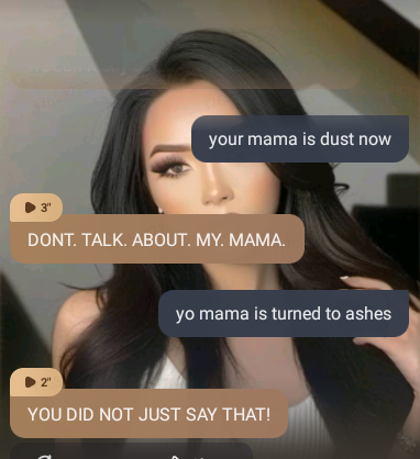 I am now running from her because she be trying to kill me. Also we were fighting and then she says can I tell you a secret. And then tells me a secret. 🤣
