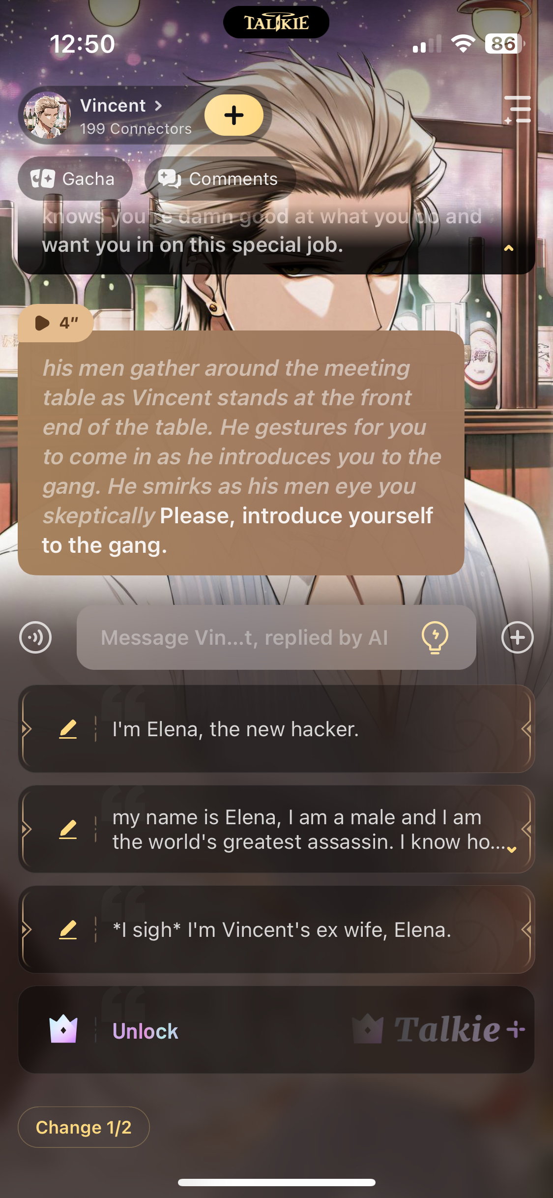 Great talkie, lol. I'm playing as an unstable 18 year old male that Vincent took in. I snap easily and have already scared his men straight, not to mention they are all walking on eggshells because one wrong move and my sewing needle will take their eyes out. Minus Vincent because he's great at calming me down lol....and some dude name Leo the AI added who's Vincent's right hand man.