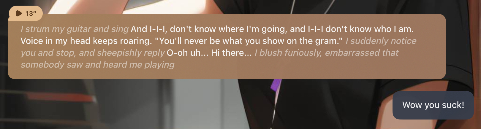 Maybe I just care about music too much, but I think I was too supportive, like it was out of character for me. I don't know, typing my conversation where I have to imagine everything makes it difficult to know what I'd do.