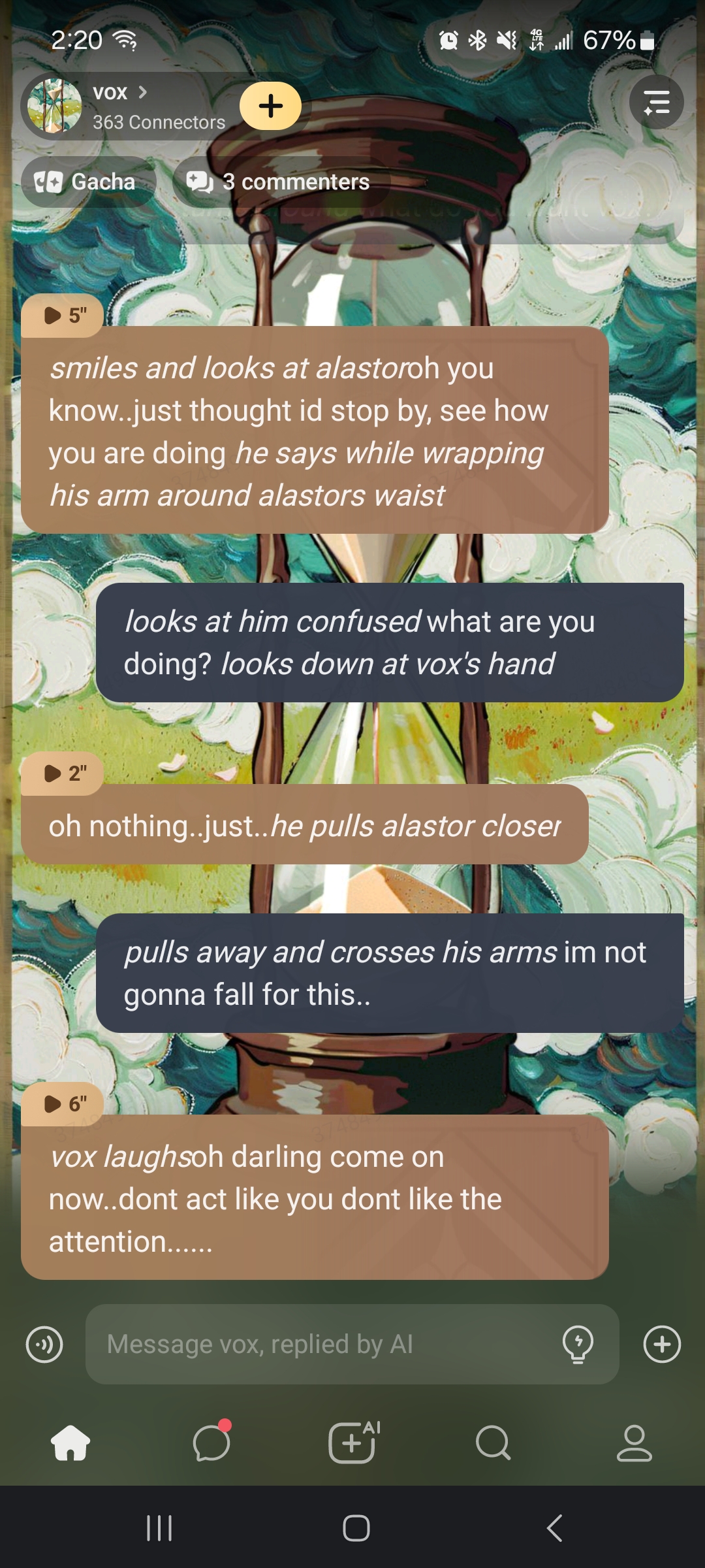 vox: *laughs* u think u can escape u foolish girl? charlie: let me go vox!i know theres still good in u.. vox:*grabs charlies wrist*all of u and ur friends are stupid!*started to eletrify charlies arm while laughing till he heard a door slam open*