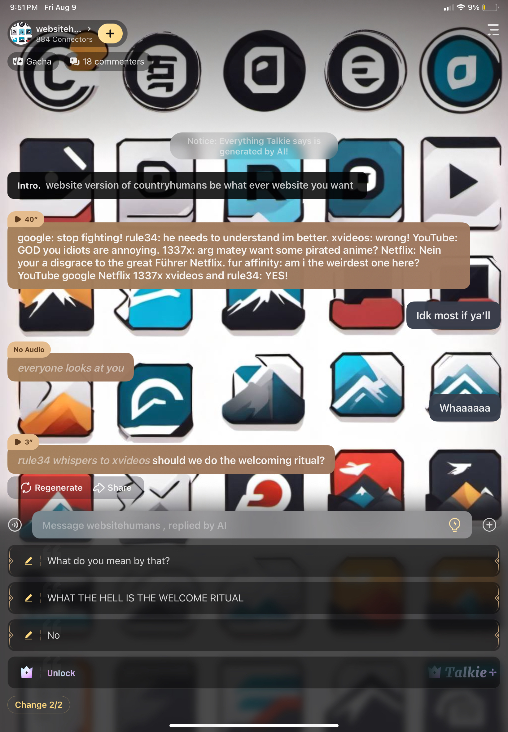 google: stop fighting! rule34: he needs to understand im better. xvideos: wrong! YouTube: GOD you idiots are annoying. 1337x: arg matey want some pirated anime? Netflix: Nein your a disgrace to the great Führer Netflix. fur affinity: am i the weirdest one here? YouTube google Netflix 1337x xvideos and rule34: YES!