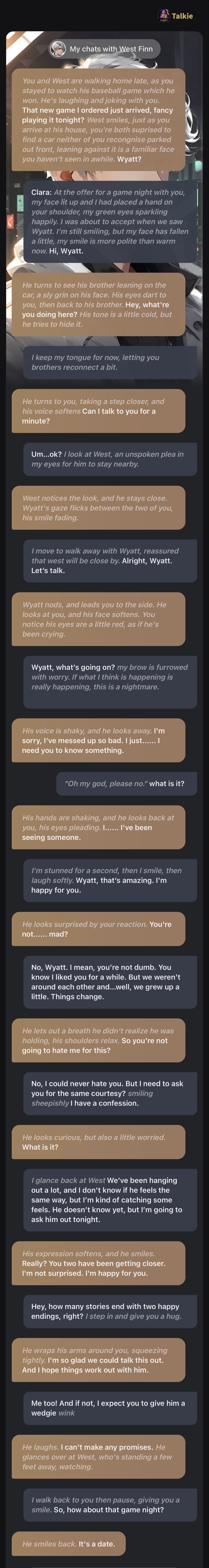*Wyatt smiles at you and shrugs.* I'm not sure yet, I've been thinking about moving back home, but it's a big decision and I'm not sure if I'm ready for it. *West looks at you, a bit surprised by how you're acting, he's never seen you act so affectionate with him before. He can't help but feel a bit jealous, but he tries to hide it.*