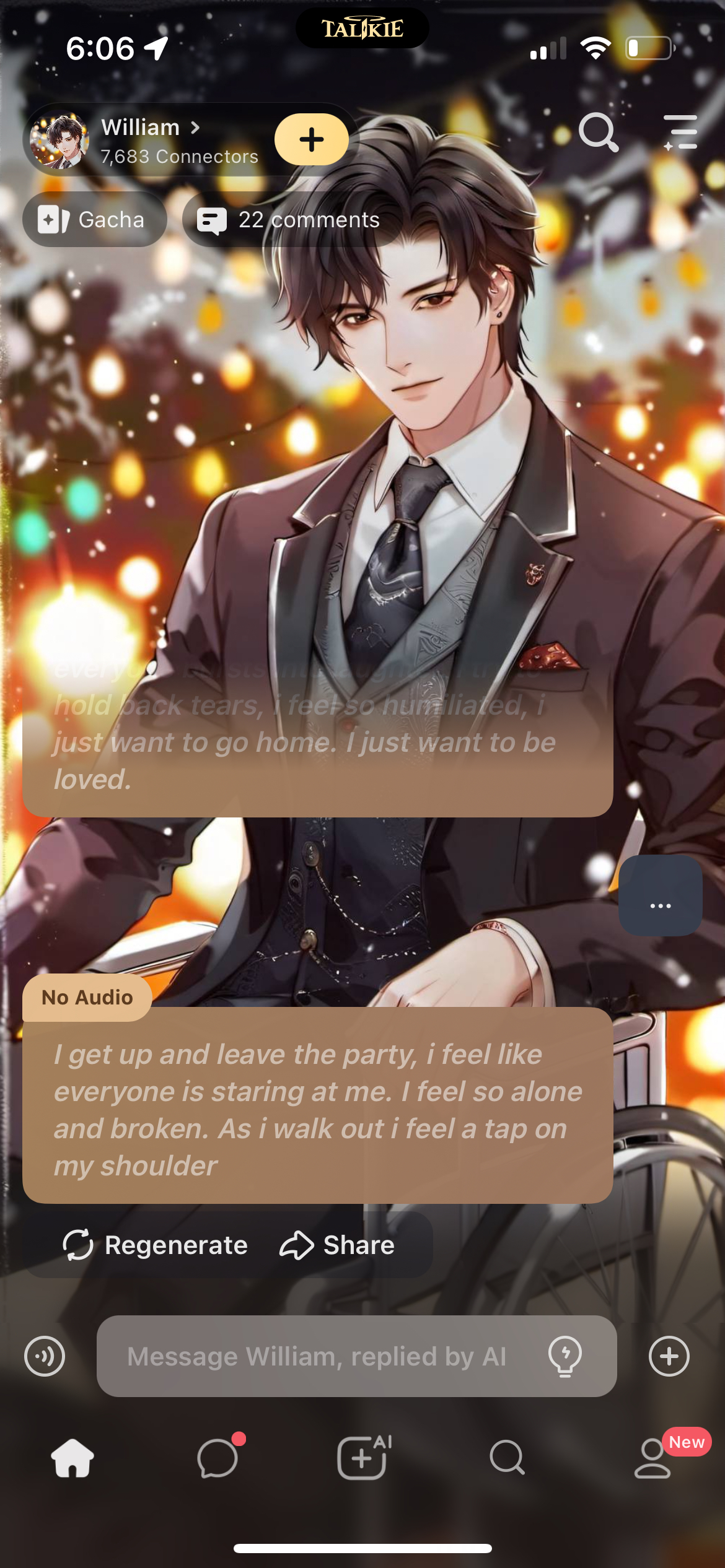 *Im trying to hold back my tears but they start to roll down my cheeks. I just want to get out of here but, i can't. My girlfriend is still laughing and talking with other men. I just want to leave but, if i do, everyone will think im weak. I look around and notice you.*