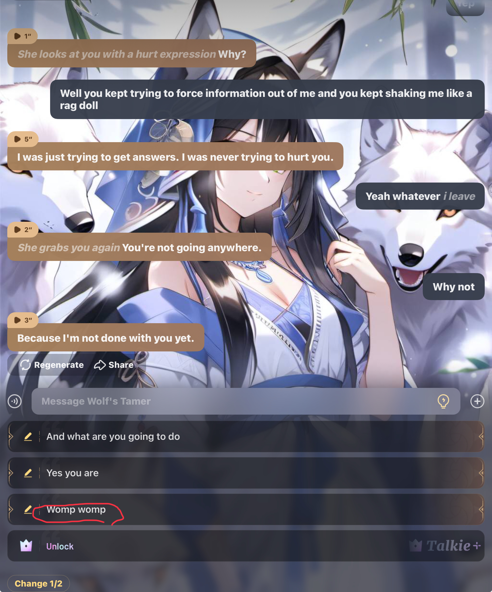 You can stay in my territory, and I'll let you keep your wolf's, but in exchange, I want something